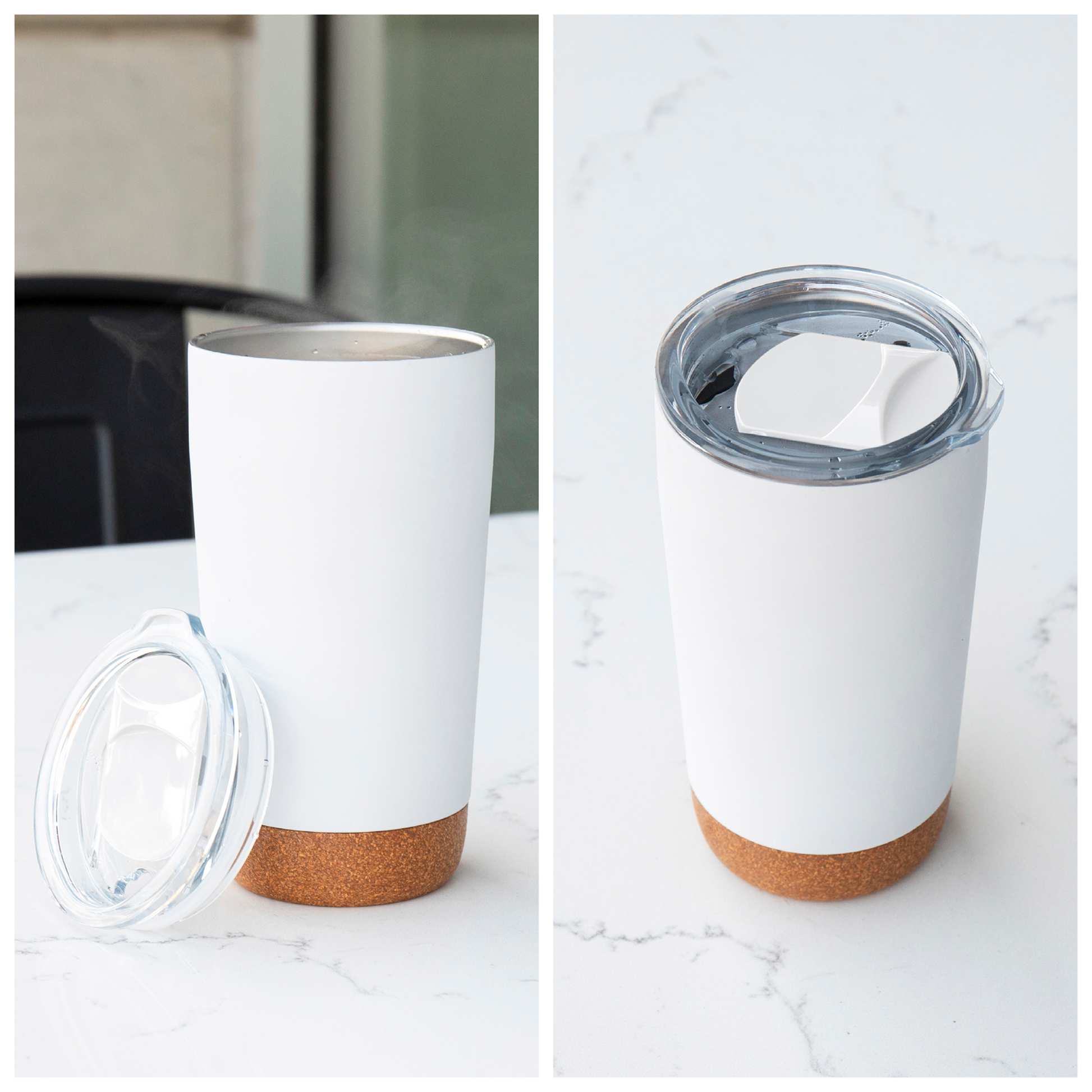 The Austin 16 oz thermal tumbler brings together style and function in a compact, everyday design. Made from double-wall 18/8 stainless steel with copper vacuum insulation, it keeps beverages hot or cold for hours. A clear push-on lid with a sliding closure offers easy sipping, while the synthetic cork base adds a natural touch and extra stability. Finished with a smooth matte exterior for a modern look.