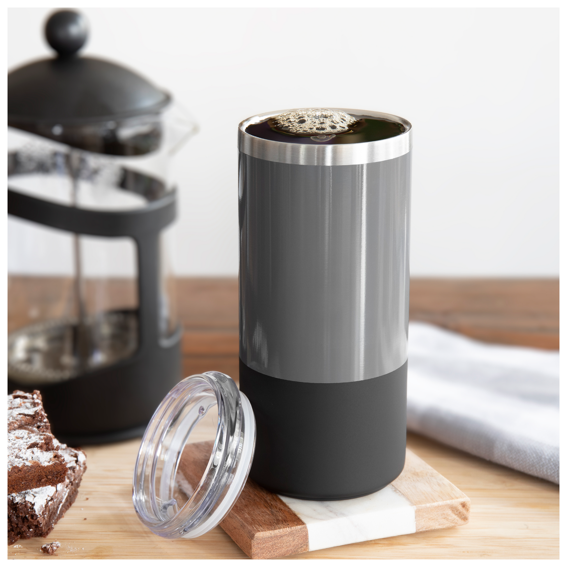 The Gala 16.9 oz thermal tumbler offers a stylish dual-tone look with premium performance. Made from double wall 18/8 stainless steel with copper vacuum insulation, it keeps beverages hot or cold for hours. It features a clear push-on lid with a sip opening, a stainless steel rim for a clean finish, and a stainless/matte dual-tone exterior for a modern, high-contrast look.