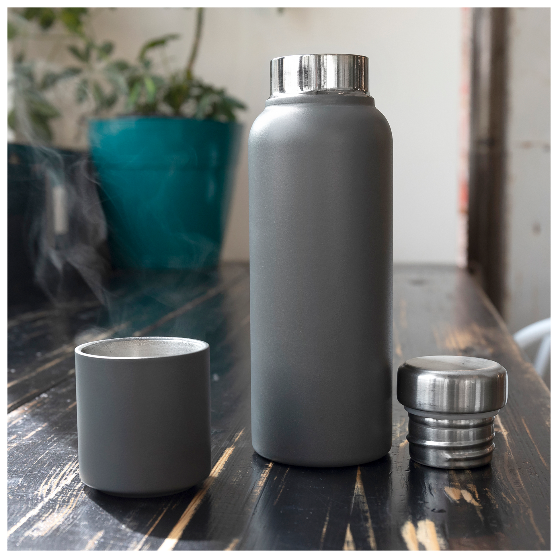 The h2go Lodge 16.9 oz thermal bottle blends rugged utility with elevated function. Made from double wall 18/8 stainless steel and copper vacuum insulation, it keeps beverages hot or cold for hours. It features a threaded insulated lid with plastic-free threading for a clean metal-on-metal seal and a magnetic lid that doubles as a cup. Finished with a durable powder coated exterior, this bottle is perfect for travel, trails, or everyday use.