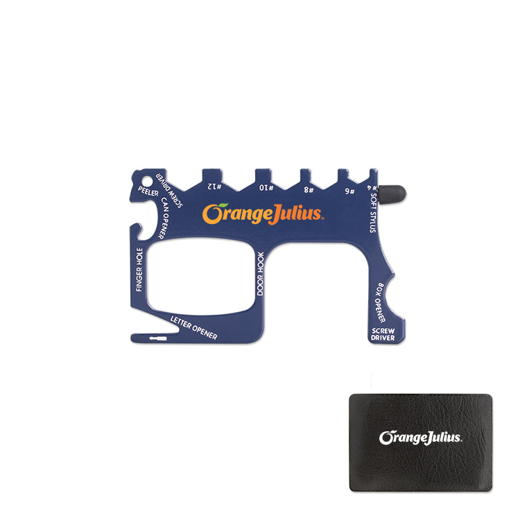 This multi-purpose No Touch (stainless steel) card tool fits in your wallet with credit cards and measures at 3 3/8" x 2 1/8". It can be used for avoiding contact with certain door handles, as a signing stylus and button pusher, repairs, mechanics, outdoor needs, camping, boating and more. There are 17 functions of this tool. Can imprint on the complementary sleeve for an additional fee. Full color print available only on tool. Sleeve only available in Black. This item is TSA compliant for air travel. But a final decision will be left up to the TSA officer. Patent #D946366.