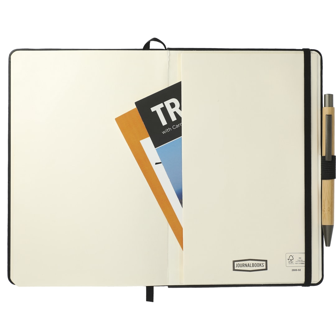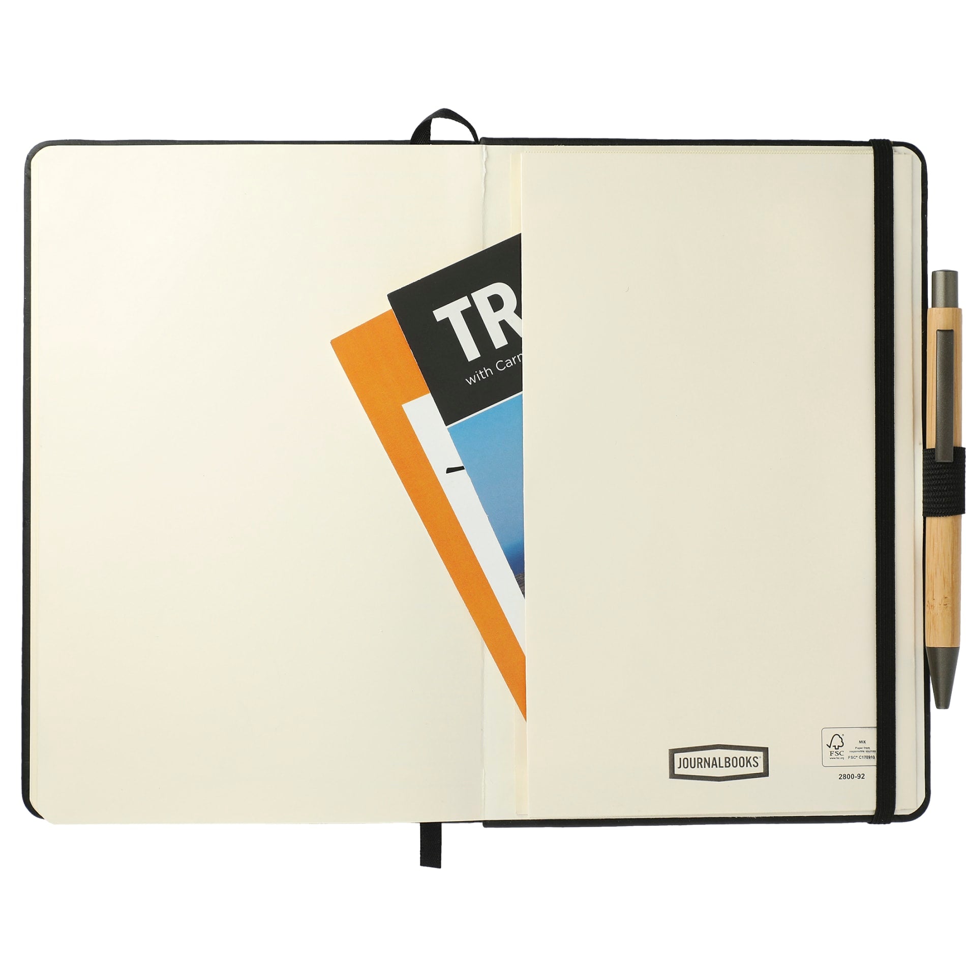 The 5.5" x 8.5" Cactus Leather Bound Journal Set includes the 5.5" x 8.5" Cactus Leather Bound Journal (2800-92) and the Bamboo Quick-Dry Gel Ballpoint (1066-49). Features a uniquely crafted cover made of 20% of cactus components and 80% bio polyurethane. Color matching elastic closure, pen loop and ribbon page marker. 80 sheets of FSC® Mix cream lined paper. Through a partnership with 1% For The Planet, one percent of sales of all EcoSmart® products are donated to environmental nonprofits.