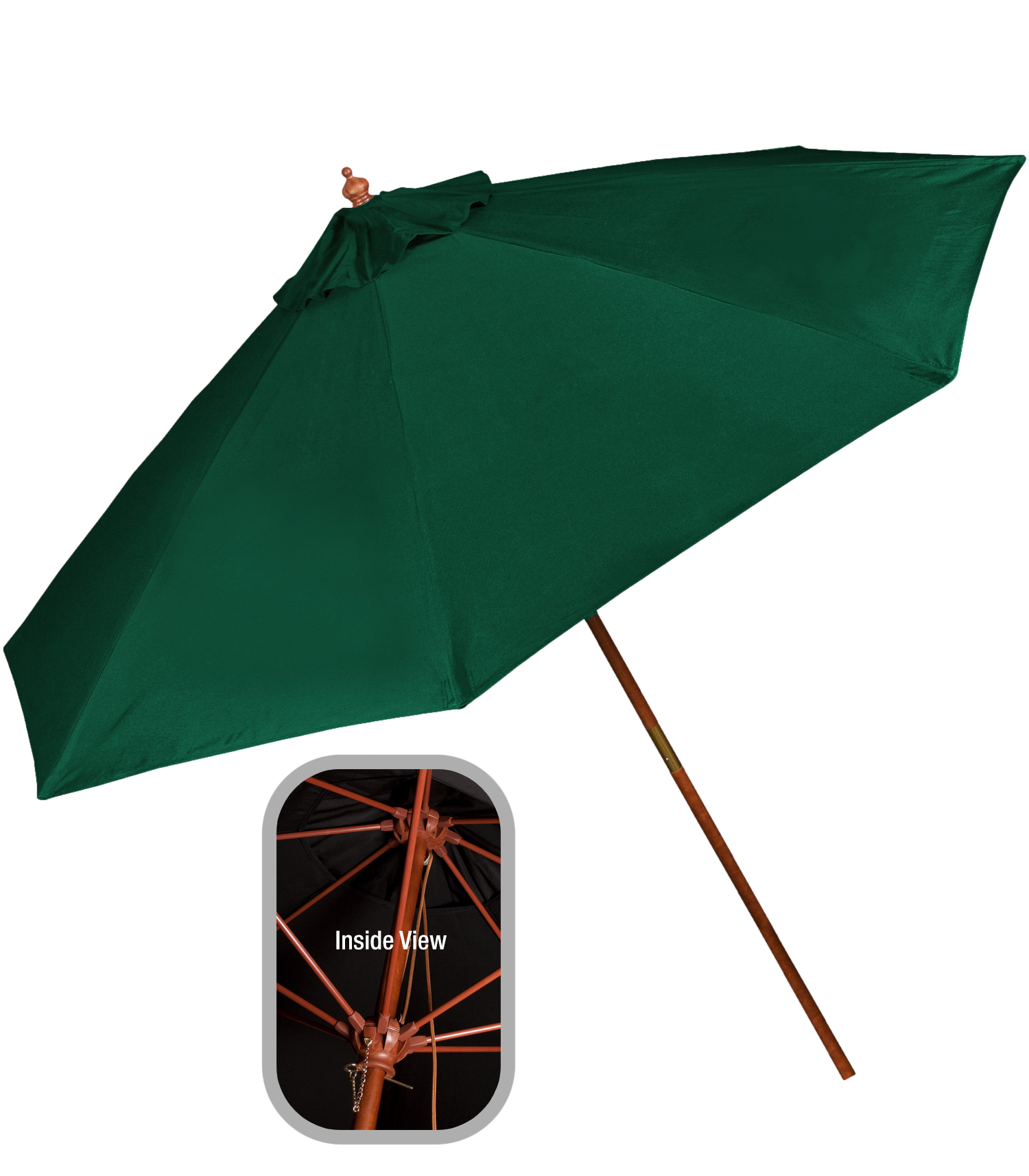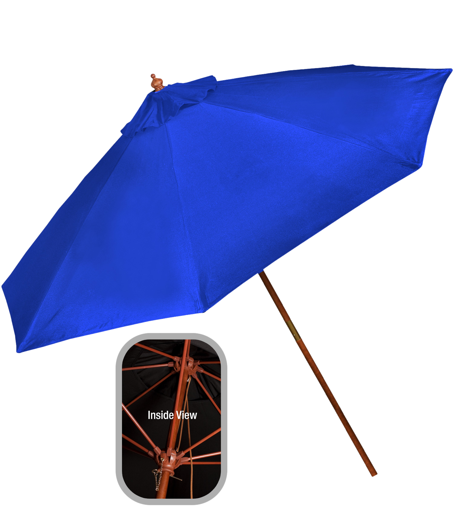 Create a strong and reliable brand image in front of customers with these promotional market umbrellas! Ideal for retail outlets, showrooms, outdoor seating areas, restaurants and more, each umbrella measures 9 feet with a Olefin (fade resistant) cover with wind vents, 8 panel configuration, 2-piece solid wood frame with pulley feature, heavy-duty 11mm fiberglass ribs, screw-in connector with brass fittings and a plastic ferrule with runner.