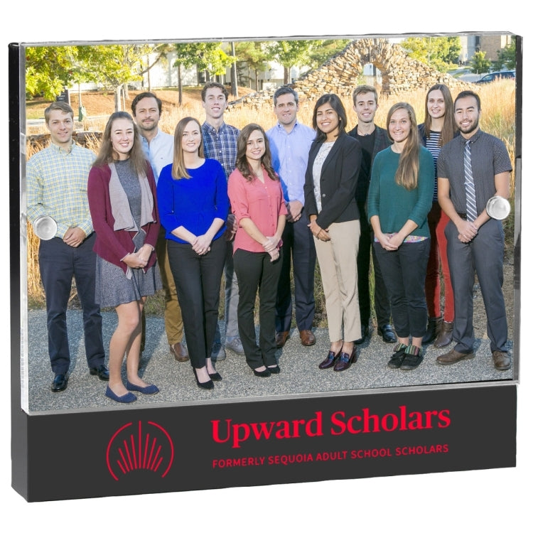 These acrylic frames are held together with small, but powerful, magnets. Your favorite pictures or inserts can easily be positioned inside for proud display. Choose from three popular sizes and include your Screen or laser engraved copy on the black base