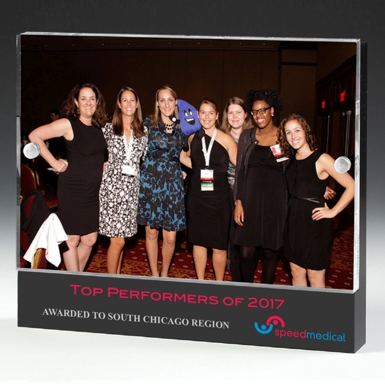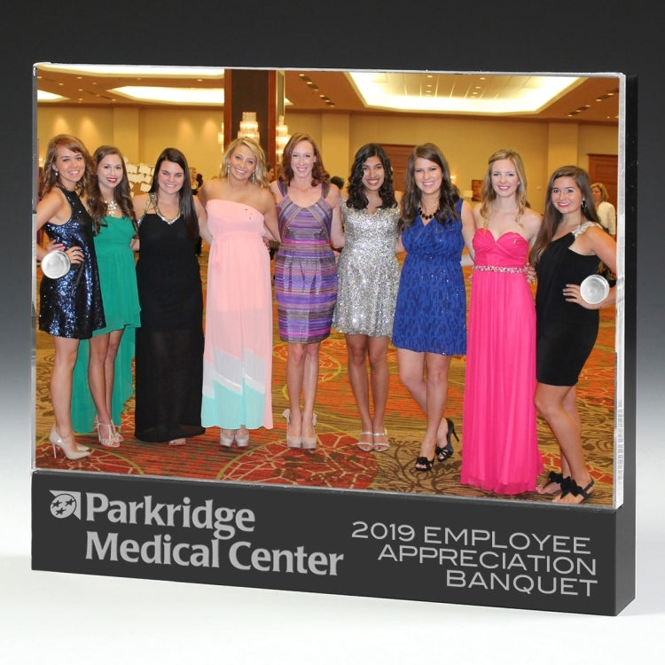 These acrylic frames are held together with small, but powerful, magnets. Your favorite pictures or inserts can easily be positioned inside for proud display. Choose from three popular sizes and include your Screen or laser engraved copy on the black base.