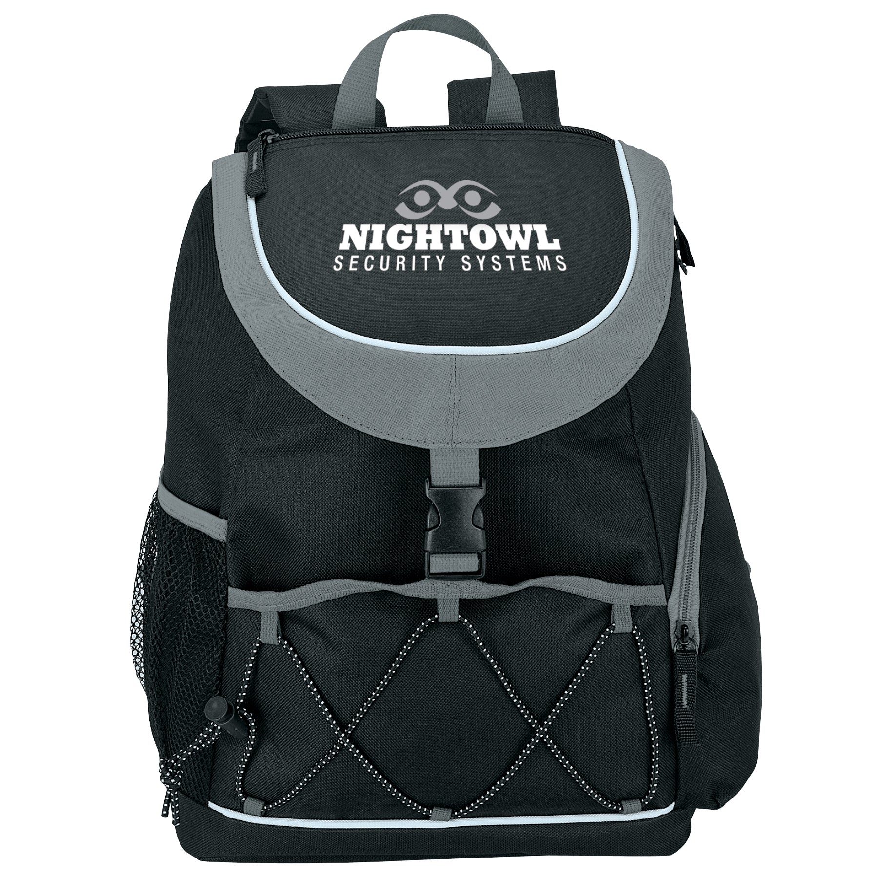 18-can backpack cooler with top flap zippered pocket, side zippered pocket, mesh side pocket, front buckled pocket with adjustable elastic cord, zippered insulated main compartment with heat sealed PEVA lining, carry handle and adjustable padded backpack straps.