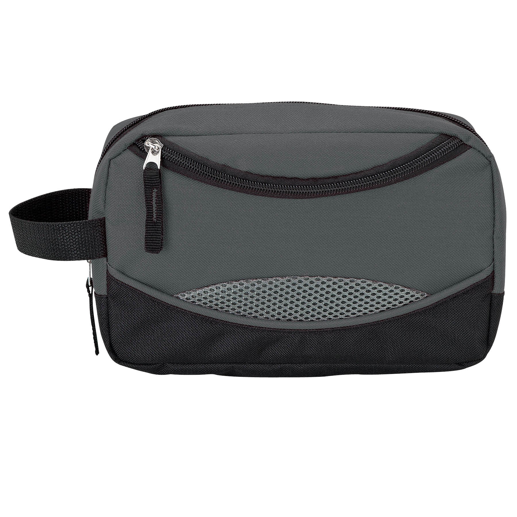 600D toiletry kit with zippered and fully lined main compartment, zippered front pocket and carry handle.