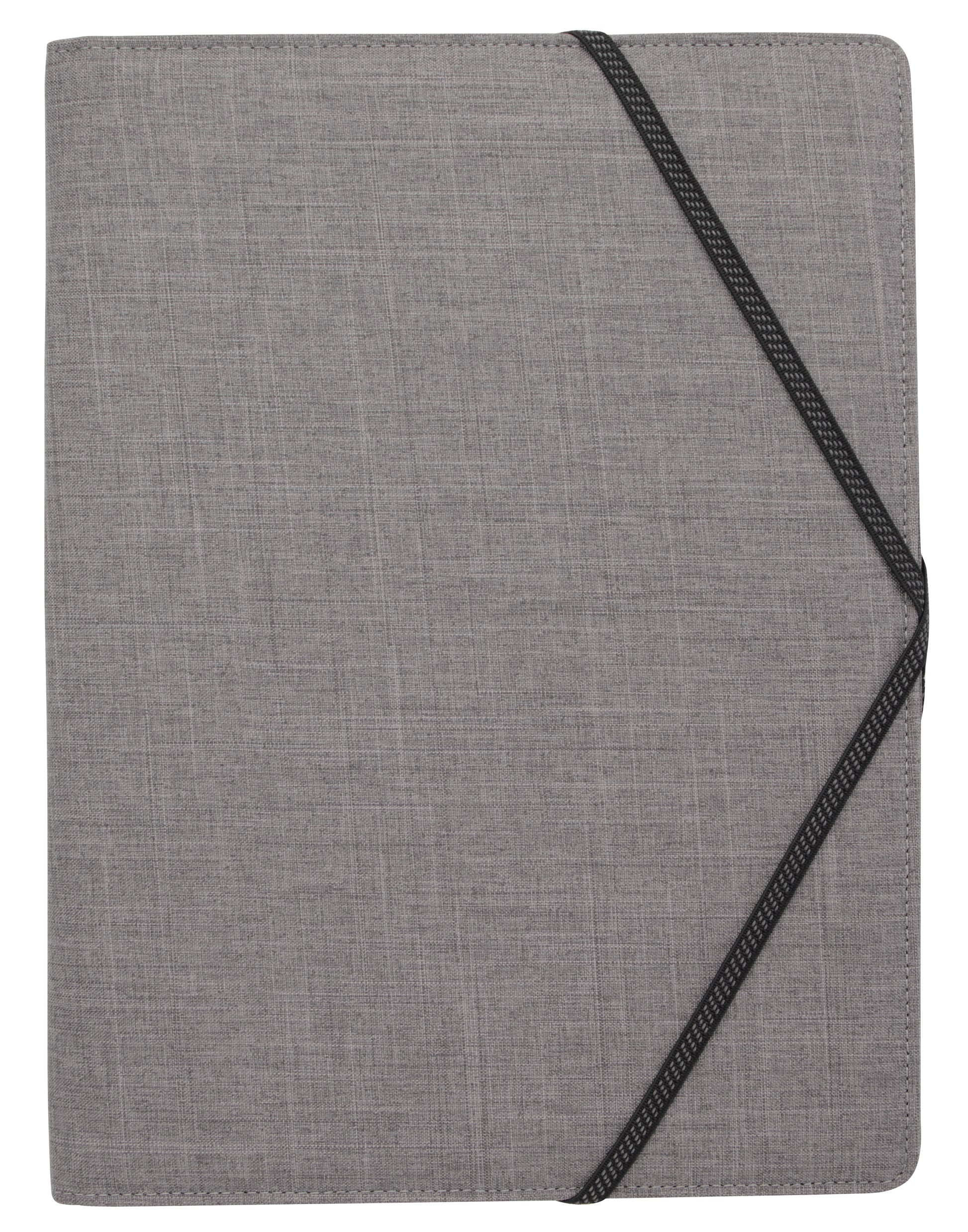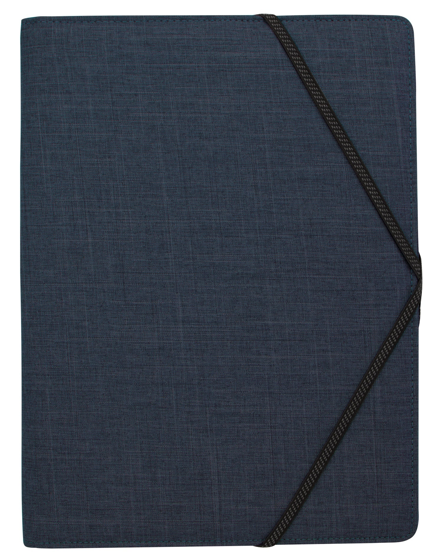 This padfolio has your organizational needs covered with a document pocket, business card slots, and a USB holder. Its two-toned polyester cover and patterned elastic strap closure make it look good, too!