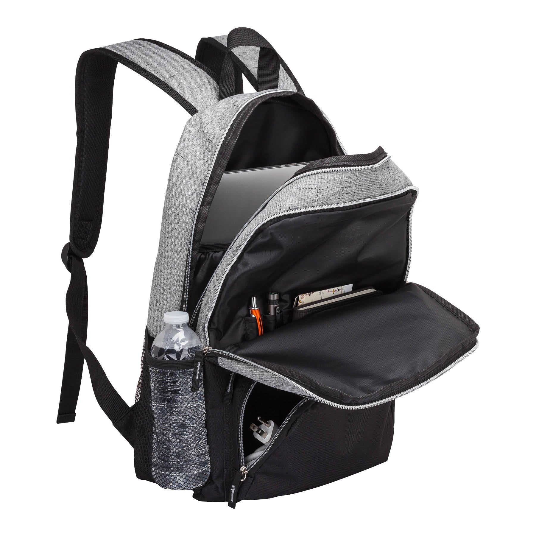 The Alabama two-tone laptop backpack is the perfect companion for a day on campus. This backpack features a wide gusseted bottom for easy packing, metallic zippers, a convenient 15" laptop pocket, a zippered compartment with organizer, two smaller zippered front compartments and two side mesh pockets. The adjustable padded shoulder straps and convenient top handle make it easy to carry.