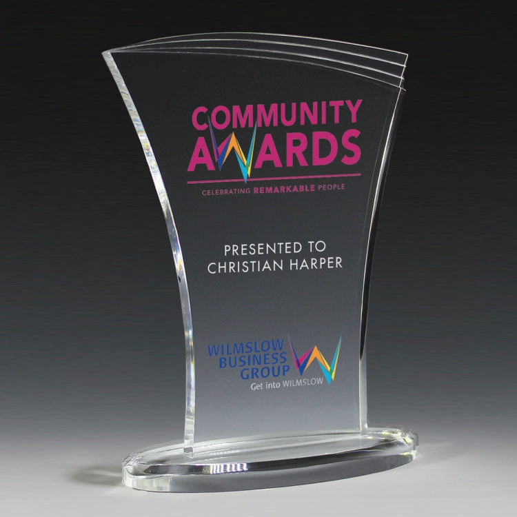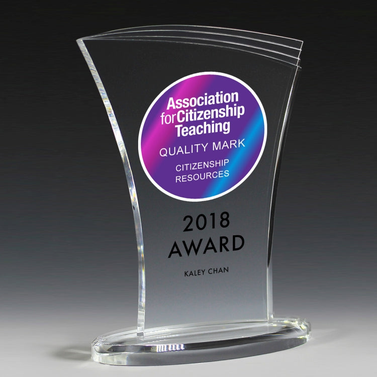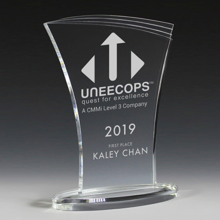 These geometric shaped awards are made with 3/8” thick acrylic with budget minded buyers in mind. They feature cascading cuts and contoured lines. They be can screen printed, laser engraved or 4 Color Process Printed