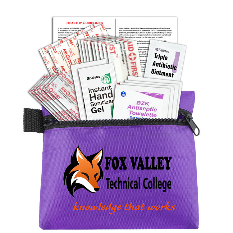 This Zippered pack contains: 10 Standard Size Latex Free Bandages 6 Small Size Latex Free Bandages 4 Antiseptic Towelette 2 Extra Large Latex Free Bandage 1 Triple Antibiotic Ointment 2 Antibacterial Hand Sanitizer 1 Healthy Guidelines Insert