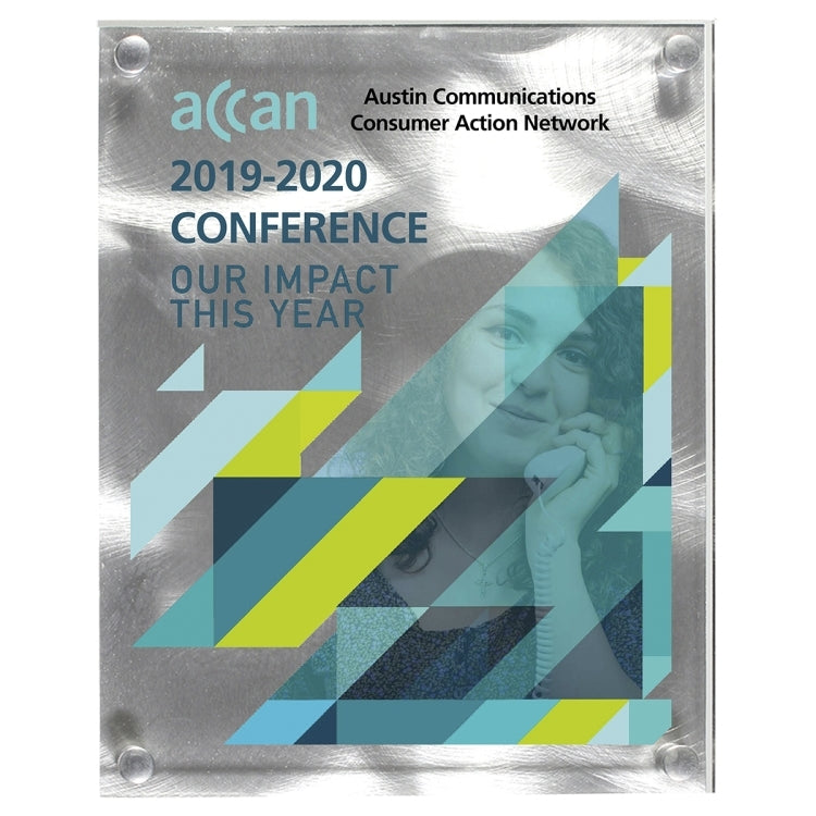 The Alumo Tech plaques feature decorative swirled aluminum mounted on beveled black acrylic. They have an elevated clear acrylic imprint panel which is held in place with decorative chrome hardware. Choose a laser engraved, screen printed or 4 color process imprint on clear acrylic panel.