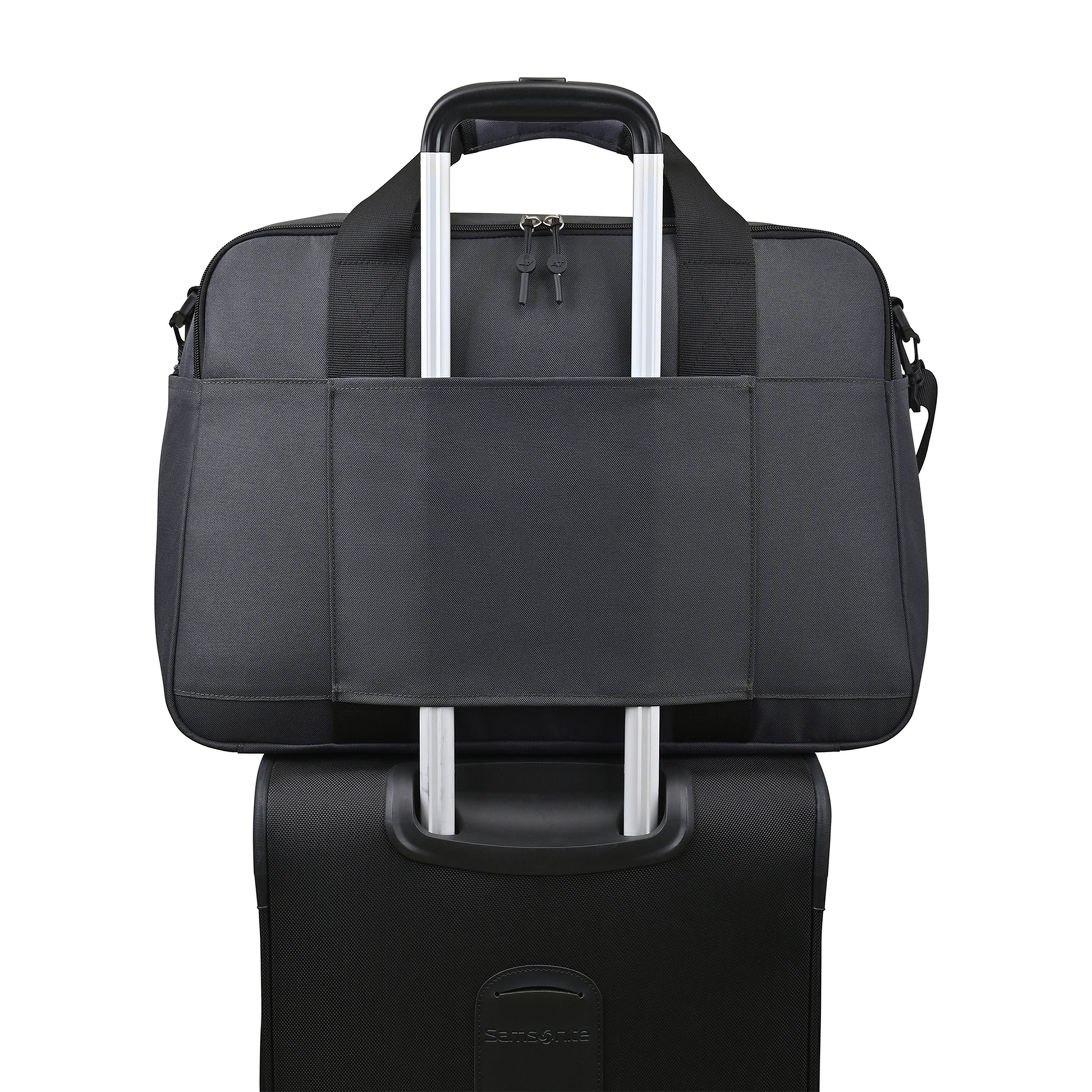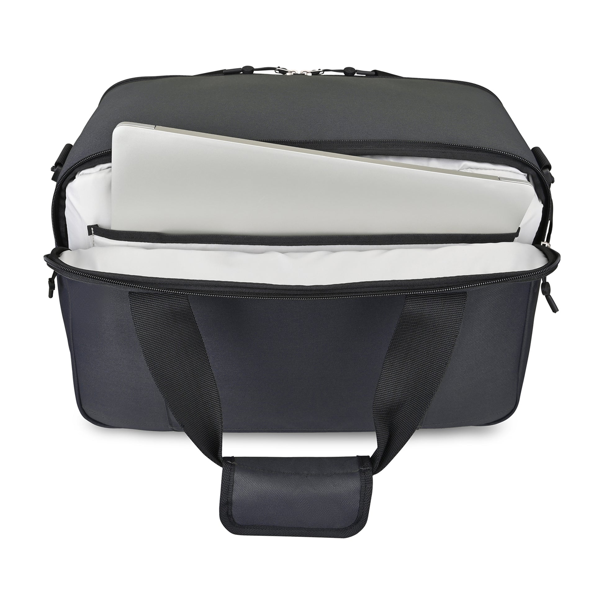 Your go-to getaway bag. The American Tourister® Embark Weekender is designed for work trips, flights, or weekends away. Features a large suitcase-style opening with compression straps, interior shoe bag, and mesh pockets for organization. A padded laptop compartment (fits up to 15"), trolley strap, and removable shoulder strap make travel effortless. PVC free.