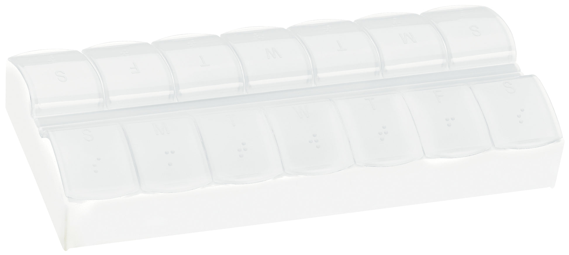 This pill box features large compartments and an easy-scoop design. It has a white base for a vivid decoration and comes with a choice of lid colors.