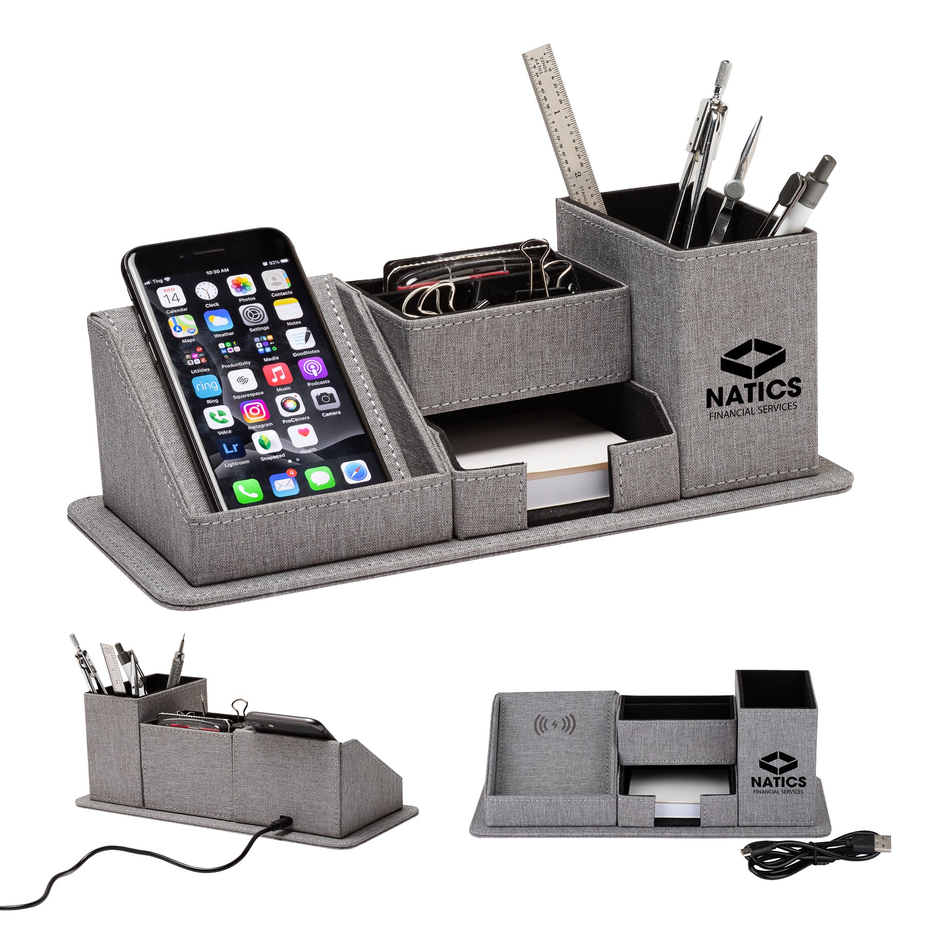 The Amridge Wireless Charging Desk Organizer is both a stylish and functional gift for your customers or employees. It includes a pen cup, 2 paper clip/accessory compartments and a 100-page memo pad. The wireless charging phone stand is compatible with most Qi enabled wireless charging devices and at 3.5 inches wide will hold most phones and a USB-C to USB-A cable to power the charger is included. The wireless charger has an auto-shut off to prevent over heating and over charging. Max. Output: Normal Charging is 5 Watts; Fast Charging is 7.5 Watts for iOS and 10 Watts for Android.