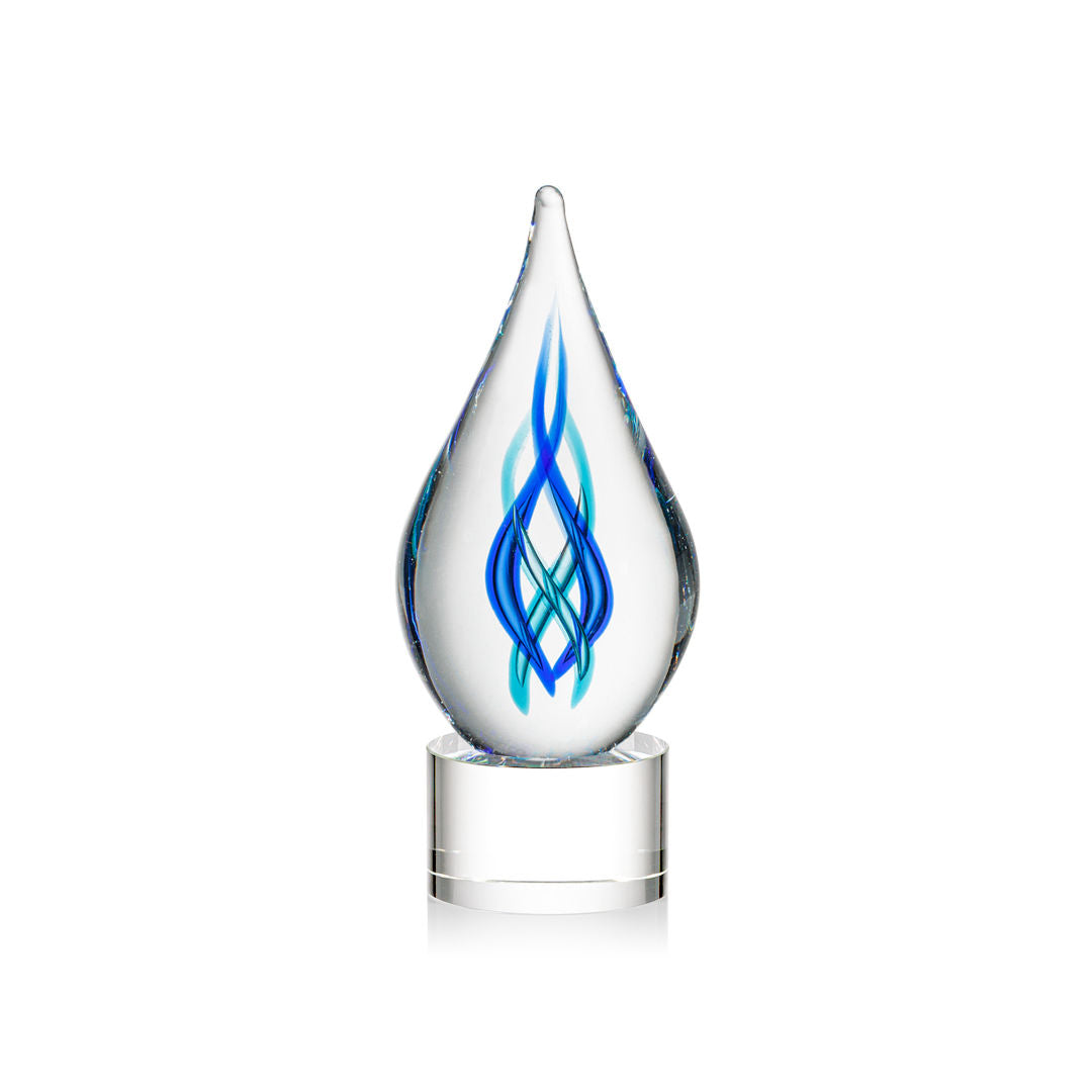 The Warrington on Marvel Base is a stunning hand-blown work of Art Complete with a complimenting Optical or Sapphire Base for personalization with a Logo or Name Each piece is individually Hand-crafted. The mesmerizing helix design in hues of blue will catch everyone's eye! No two pieces are identical. All sizes are approximate and will vary from piece to piece. Packaged in a black satin-lined presentation gift box.
