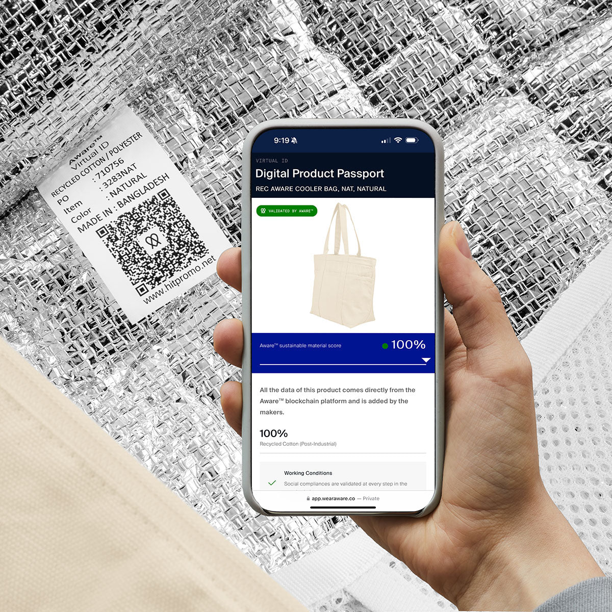 Made Of Combo: 8 Oz. 70% Recycled Cotton And 30% Recycled Polyester With Aluminum Lining and EPE Foam Insulation. 285 GSM. Zippered Main Compartment . Back Zippered Pocket . 3 Front Slip Pockets . 10" Handles. Holds Up To 20 Cans. The AWARE™ Exterior Is The World’s First Hybrid (Physical Tracer & Public Blockchain) Traceability Technology Delivering An Indisputable Way To Track And Validate Textile Impact From Origin To Consumer . Scan The QR Code Located Inside The Product To Access The AWARE™ Virtual ID & Product Passport . To Learn More, Visit Wearaware.co. Spot Clean/Air Dry .