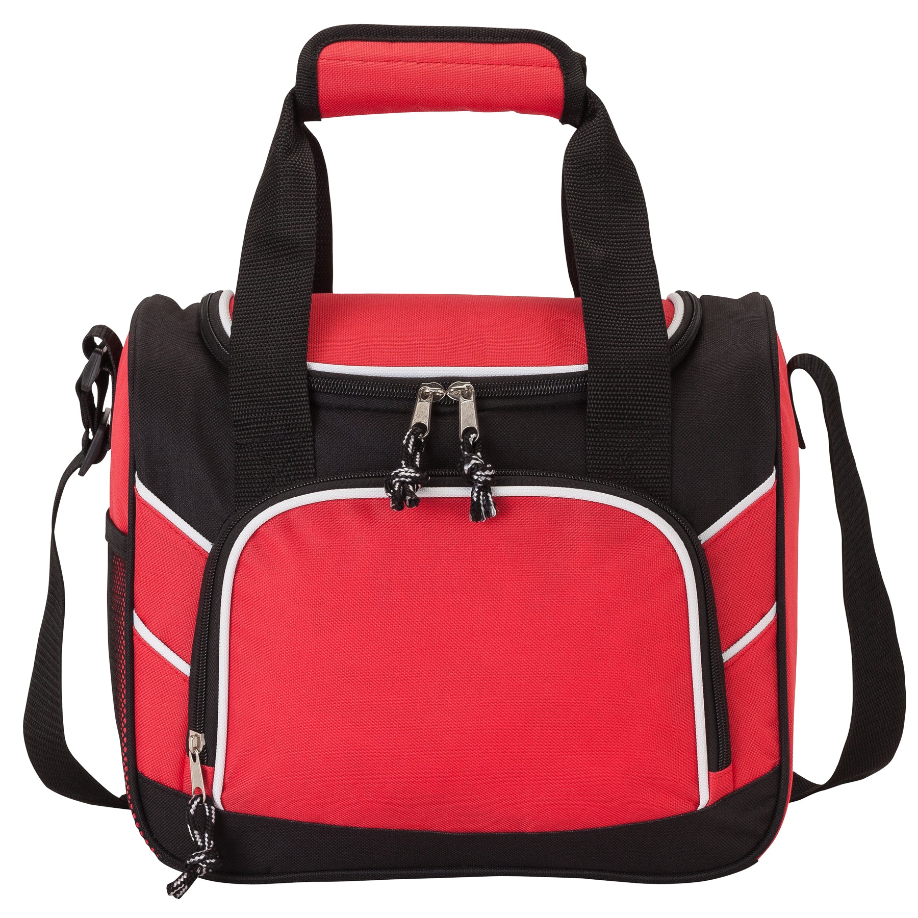The Balboa lunch bag cooler is made from durable 600D and offers a 20-can capacity and zippered main compartment with PEVA lining. The bag also features a zippered front storage pocket for napkins and utensils, a 1 1/2" x 49" adjustable shoulder strap, mesh side pocket, white piping accents and two-tone zipper pull tassels. Cooler easily collapses down for storage.