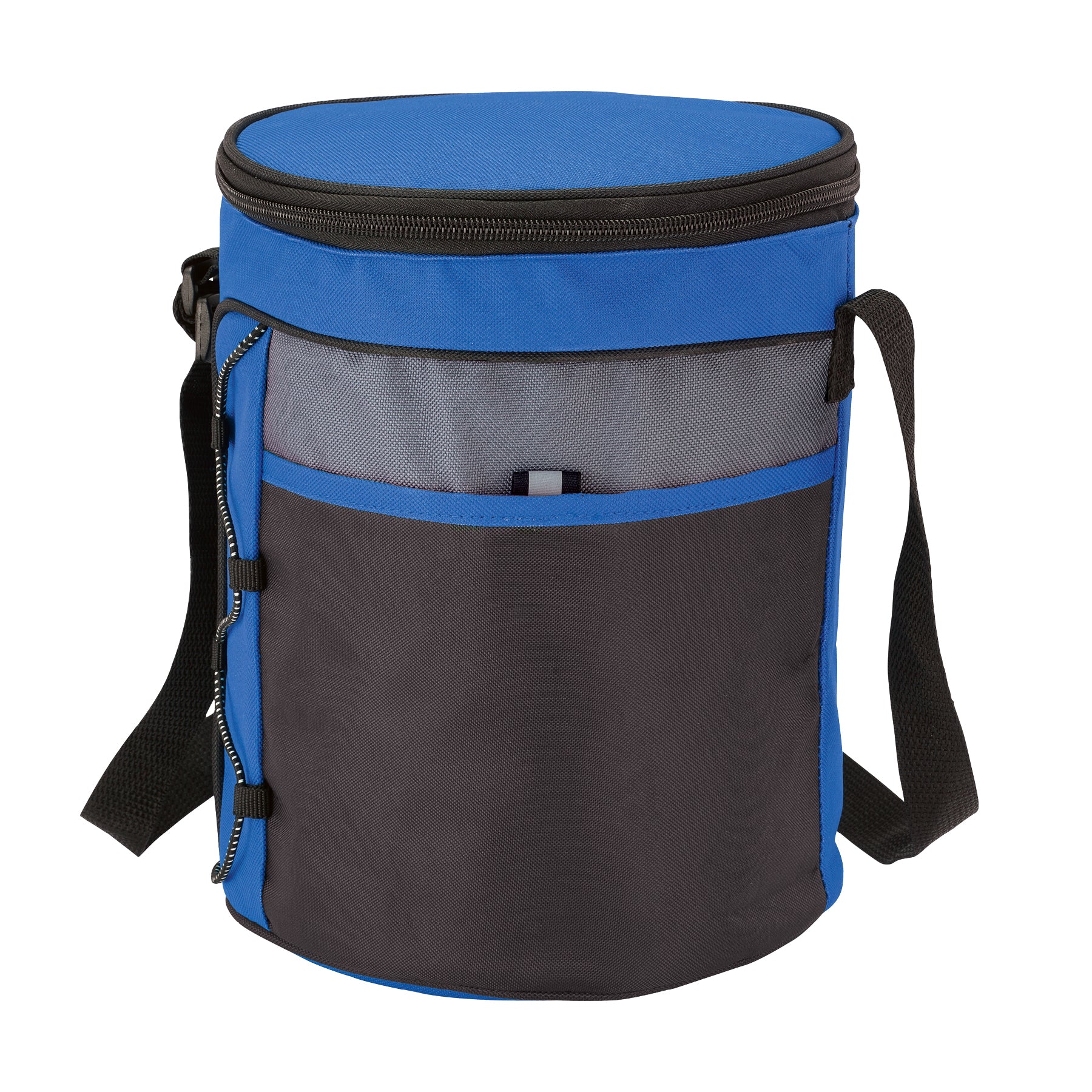 12-can tri-tone barrel cooler is made from durable 600D and 420D poly and features a zippered watertight main compartment with heat-sealed PEVA lining, front pocket with hook and loop closure, elastic storage cord and a 1" x 43" adjustable shoulder strap. Cooler easily collapses down for storage.