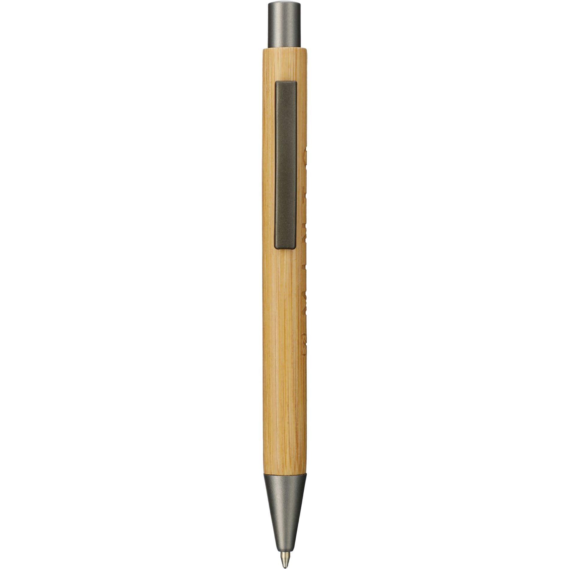 The Bamboo Ballpoint features a 100% bamboo barrel with gunmetal accents. Equipped with ultra-smooth, quick dry semi-gel black ink cartridge. Click action mechanism. Pen tip is 1 mm. Writing length is 800m. Laser finish is light to dark brown wood burned appearance.