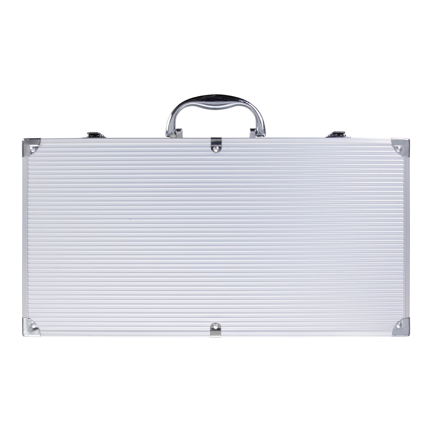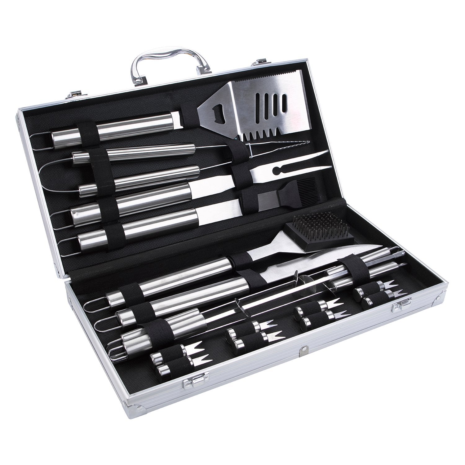 Take your grilling game up a notch with this 18-piece barbecue set that’s ready to flip, glaze, and skewer whenever you are! This durable stainless steel set includes a fork, large knife, tongs, scraper/brush, multipurpose spatula, basting brush, 4 skewers, and 8 corn holders. The aluminum case keeps things tidy between grilling sessions and makes it easy to tote your tools of the trade to a campsite, tailgating party, and more.
