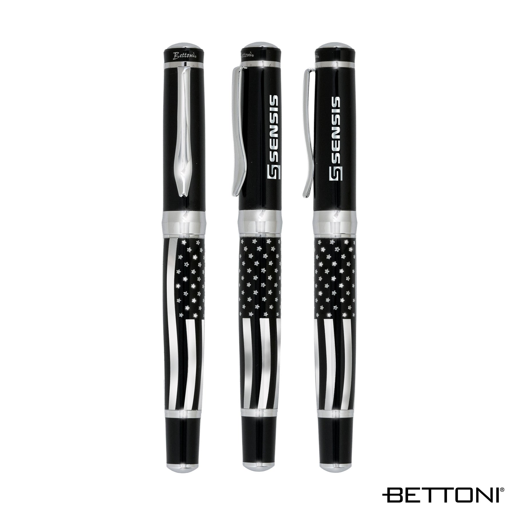 The stylish Americano Rollerball Pen from Bettoni® features a sophisticated cap-off design. The chrome barrel showcases a striking USA flag design, complemented by a high-gloss lacquered brass cap for a refined finish. It has a heavyweight brass construction for a balanced feel and comes equipped with a German-made black ink refill, delivering consistent and reliable writing performance. Each Bettoni® writing instrument is packed in a black triangle gift box.