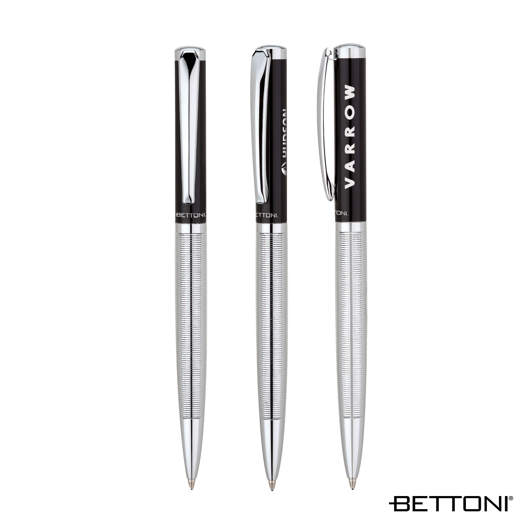 Bettoni slim line solid brass twist-mechanism ballpoint pen with high-gloss lacquered cap and etched chrome ringed barrel.