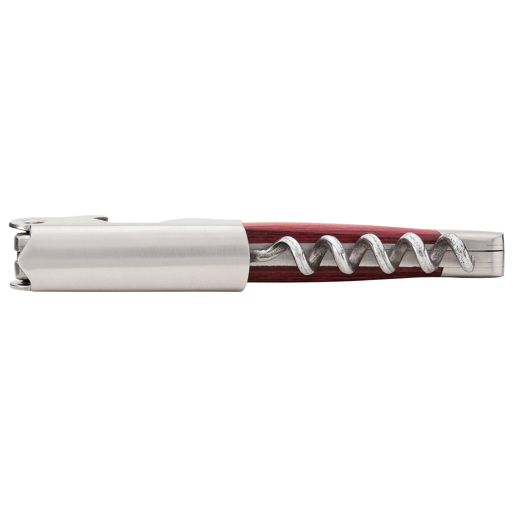 This bar tool has corkscrew, knife / foil cutter, bottle opener with a rich wood inlaid handle.