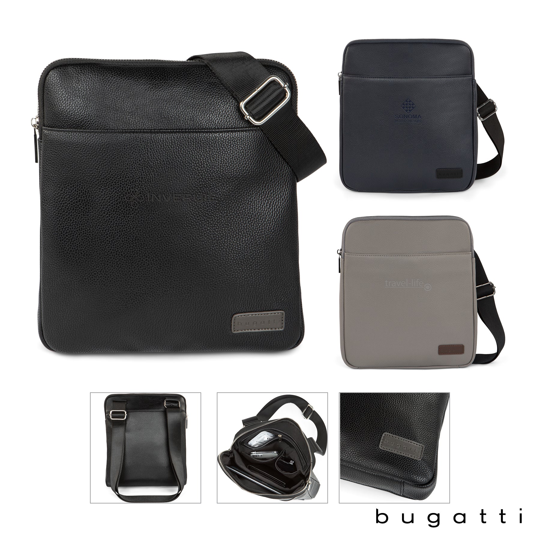 Go from the office to happy hour with the Bugatti Contrast Collection Crossbody Bag. Designed for an active lifestyle, this crossbody bag is made of durable pebble grain leather and can be worn at your preferred position with the 1 1/2" x 55" adjustable and comfortable crossbody strap. A convenient front pocket with magnetic closure keeps your more frequently used items easily accessible. The main zippered compartment features a padded tablet pocket, 2 slip pockets for smaller items and a zippered pocket for valuables. This bag includes a Bugatti zipper pull and a two-year limited manufacturer warranty.