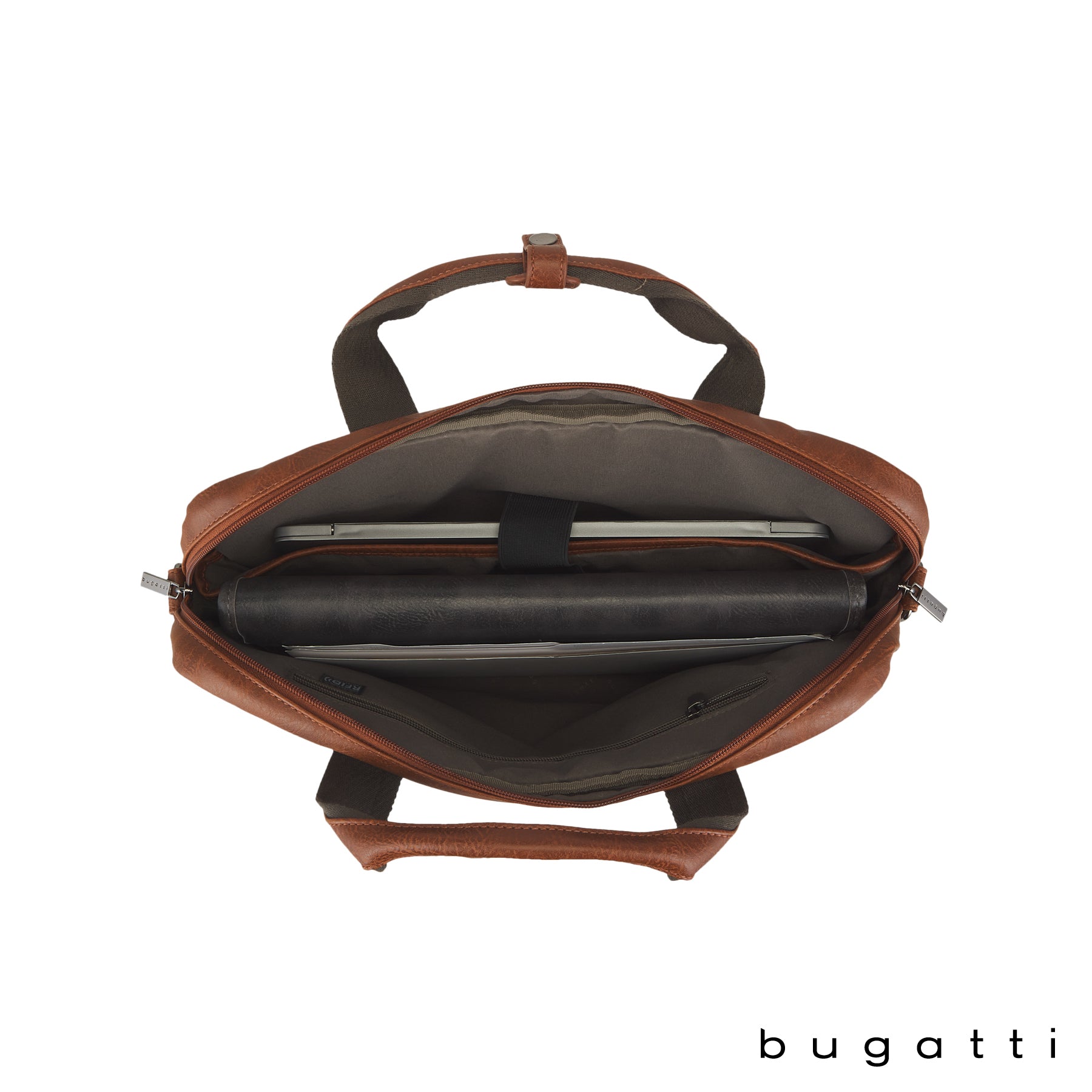 Whether heading to the office, an important meeting or traveling for work, make a bold statement of style and sophistication with the Bugatti Valentino Briefcase. This sleek designed laptop bag is crafted with premium vegan leather and cotton canvas trims and is fully lined with soft-touch Bugatti lining. The main compartment has a padded 15.6-inch laptop pocket and a zippered pocket with RFID anti-identity-theft protection. Four zippered pockets with multiple interior pockets provide ample organization for all your papers and accessories. Carry it securely with the reinforced carry handles, the cotton canvas removable and adjustable strap with shoulder pad and metal hardware, or open the rear pocket to utilize the hideaway cotton canvas trolley strap.