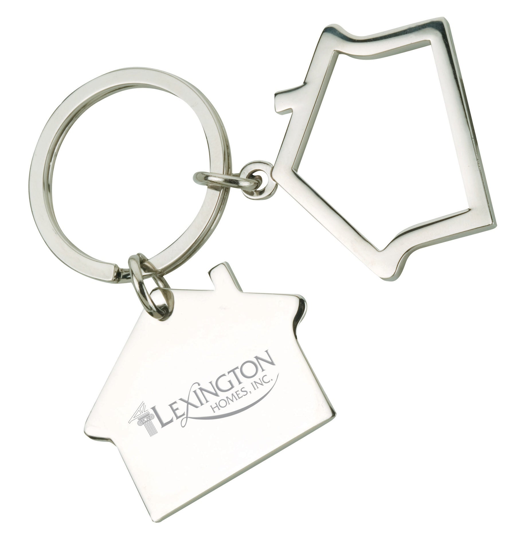 Split ring featuring two house shapes, one solid, one outline, with a shiny nickel finish.