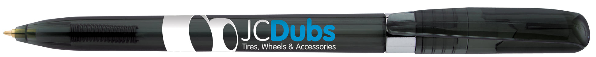This sleek twist-action retractable pen features a slim profile design, chrome-plated ring, and popular clear colors. See details