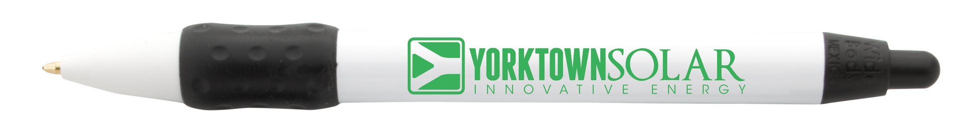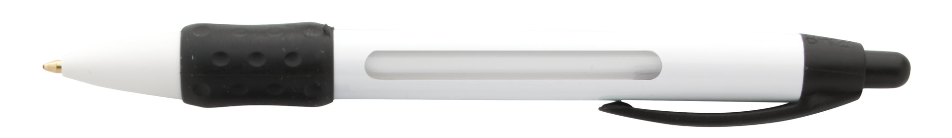 This pen has a wide profile design that accommodates a large barrel imprint and the ability to customize up to six rotating messages. Stock messages are available.