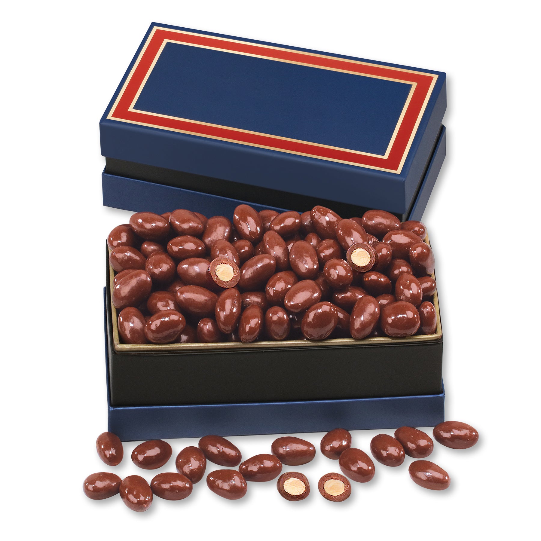 The classics never go out of style! Whether it's the preppy appeal of the sleek box or the gourmet delights contained within, everyone is sure to find something to love in this great gift. Each box comes filled with three-quarters of a pound of our famous chocolate covered almonds, sure to wow every recipient. Your logo foil-stamped in gold on the gift box lid is the pice de rsistance of this memorable experience. Contents: Milk Chocolate Almonds, 3/4 lb.
