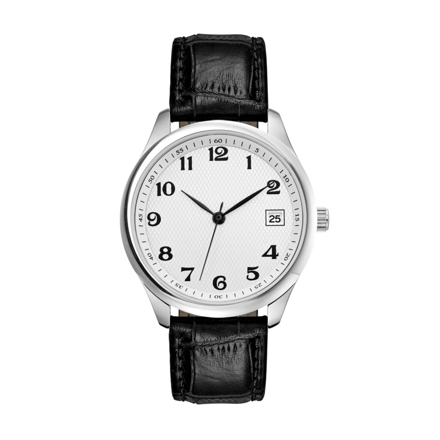 36mm Metal case, silver finishing, high precision Japanese 3 hand movement, date display, mineral crystal, crocodile grain leather straps, water resistant.