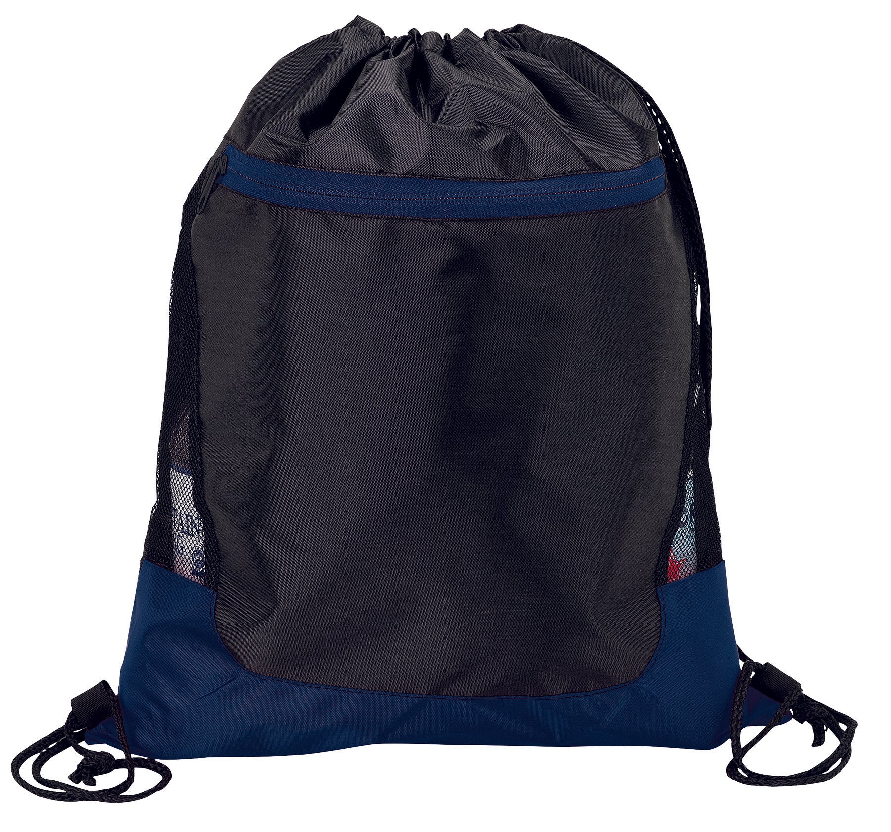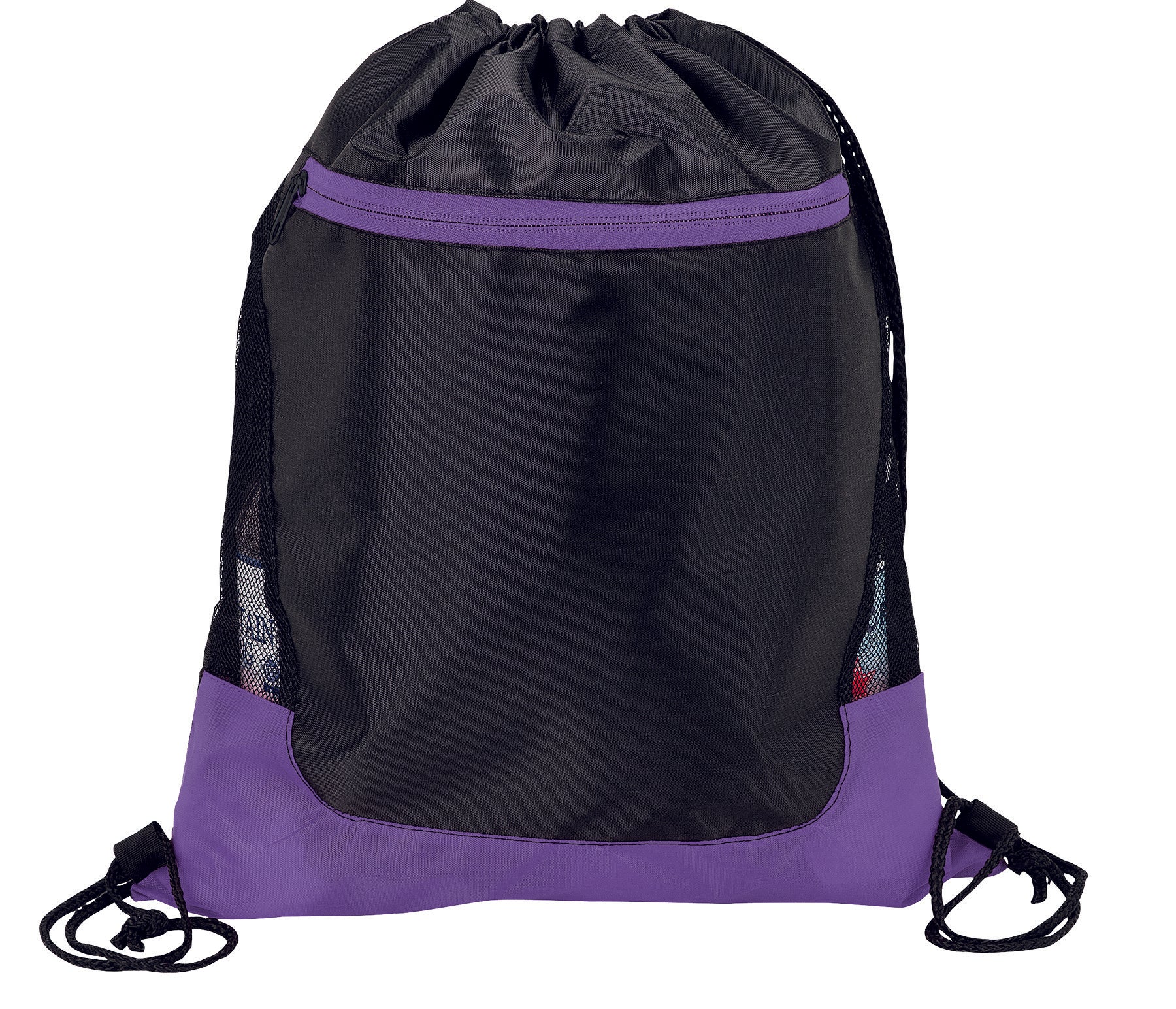 Sport bag has drawstring closure, zippered front pocket and mesh side trims. Drawstrings double as backpack straps.