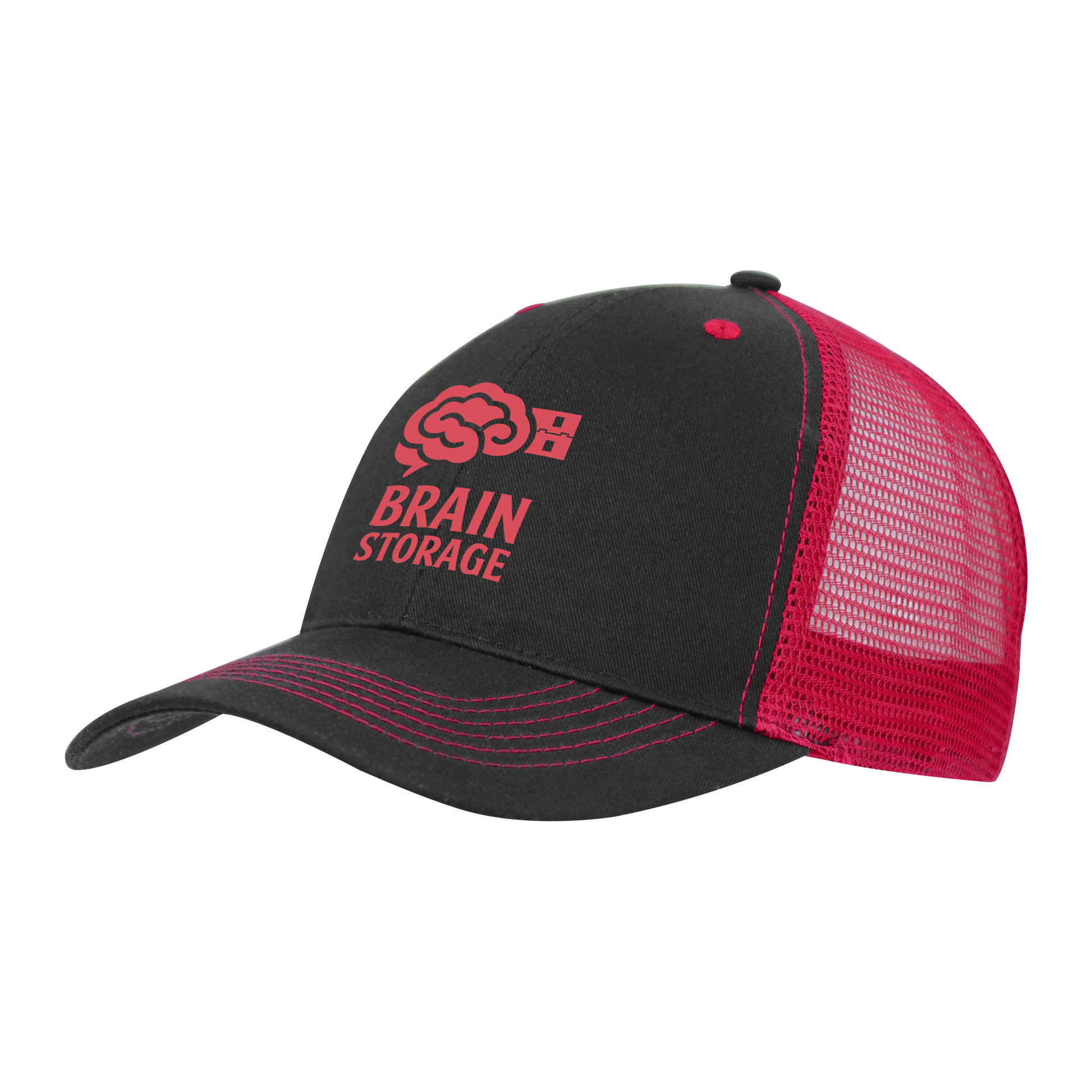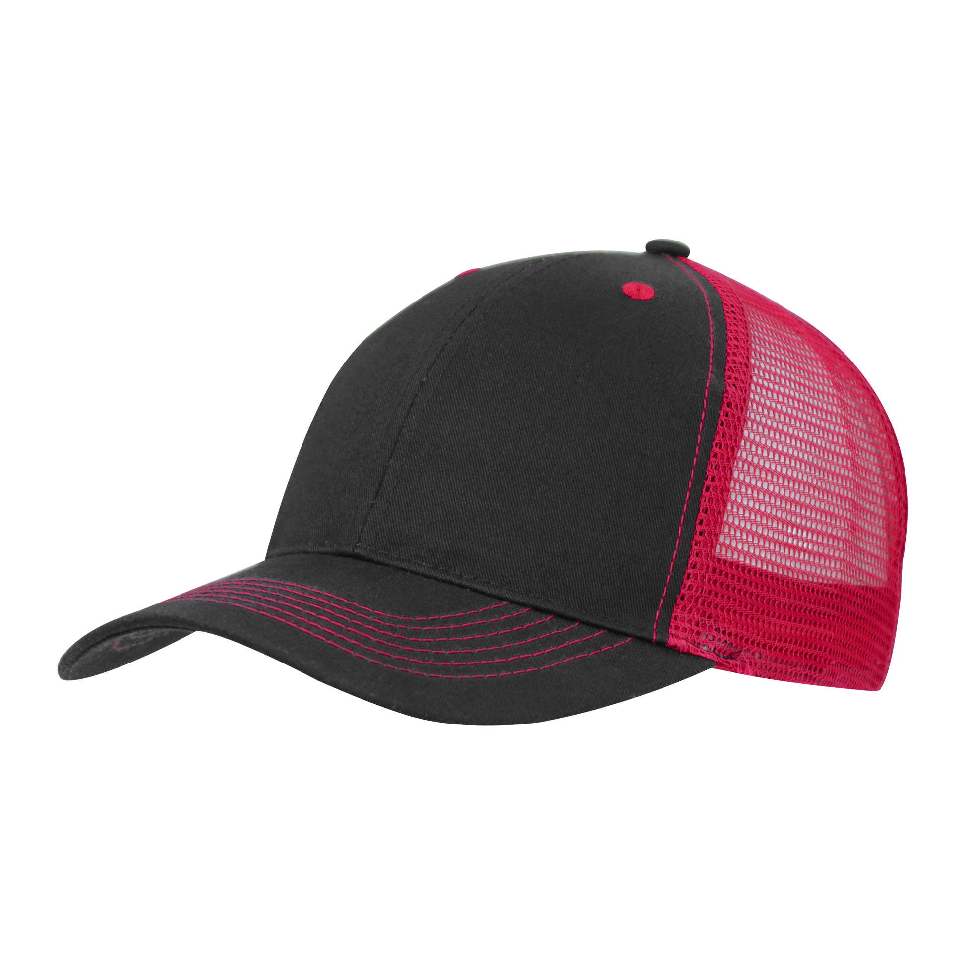 Color Accent Mesh Snapback Cap - Features accent color stitching on eyelets and visor, a 3.25" crown, structured design, and one size fits most.