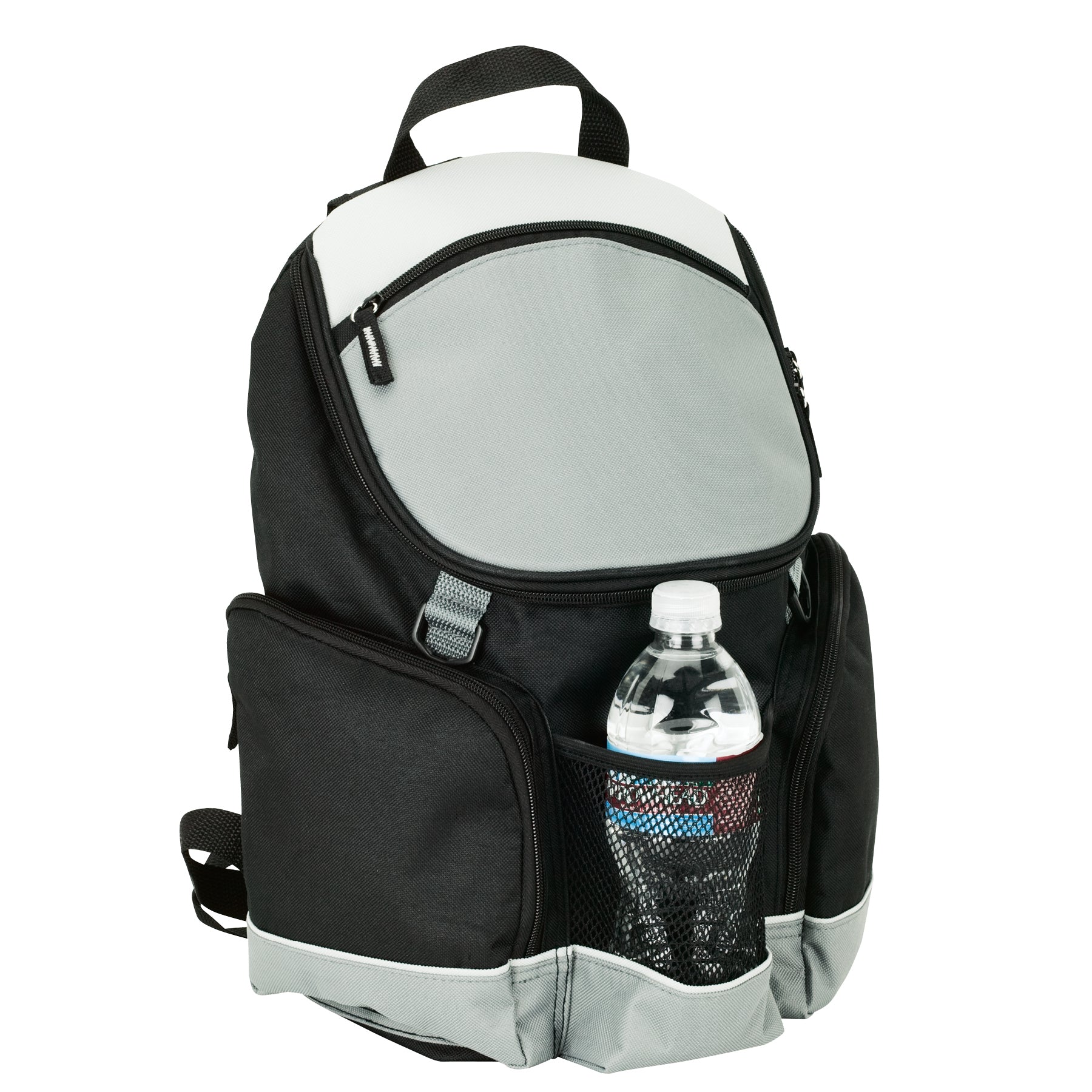 This backpack cooler keeps up to 16 cans cold and is made from durable 600D material. It features a main compartment with heat-sealed PEVA lining, adjustable padded backpack straps, carry handle, zippered top flap pocket, two zippered side pockets and a mesh front water bottle pocket.