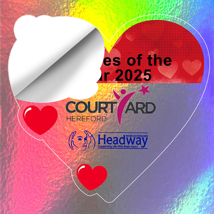 Our CustomCut™ Sticker/Decals are made with a Professional Grade Clear 6 Mil Glossy Halographic Metallic looking Vinyl Material. Each Sticker is individually kiss cut to the contours of your custom logo design. There are No Die or Die Cutting Charges! They come in individual single sheets for easy distribution (as opposed to a continuous roll). For indoor and outdoor use, water resistant and removable for up to one year. (exposure to direct sunlight may accelerate fading). Pricing includes up to a full color PhotoImage® digital imprint. All Sticker designs inside the Sheet require a 1/8” white border around the artwork design.