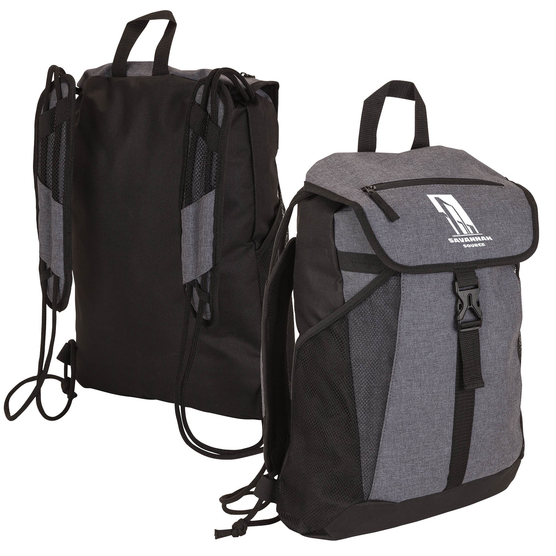 The Cypress backpack has unique drawpull closure and is made from 300D polyester canvas. There is a large main compartment, front flap with buckled closure and zippered pocket, front storage pocket with mesh sides and elastic straps for expandability. Padded backpack straps and carry handle make it easy to bring your stuff along.