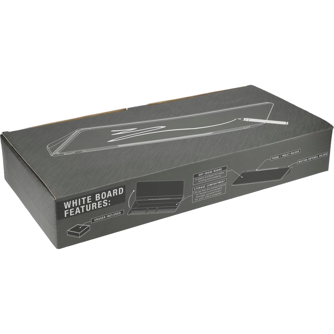 The Desktop White Board makes a great addition to any office! The shape of the white board allows it be positioned in front of your computer. Instead of wasting sticky notes you can write down your daily to do list on the desktop white board. Underneath the white board is storage for your office accessories. A white board eraser is included. Please note the whiteboard doesn’t include a white board marker. A premium 1 pc giftbox is included as the standard packaging option.
