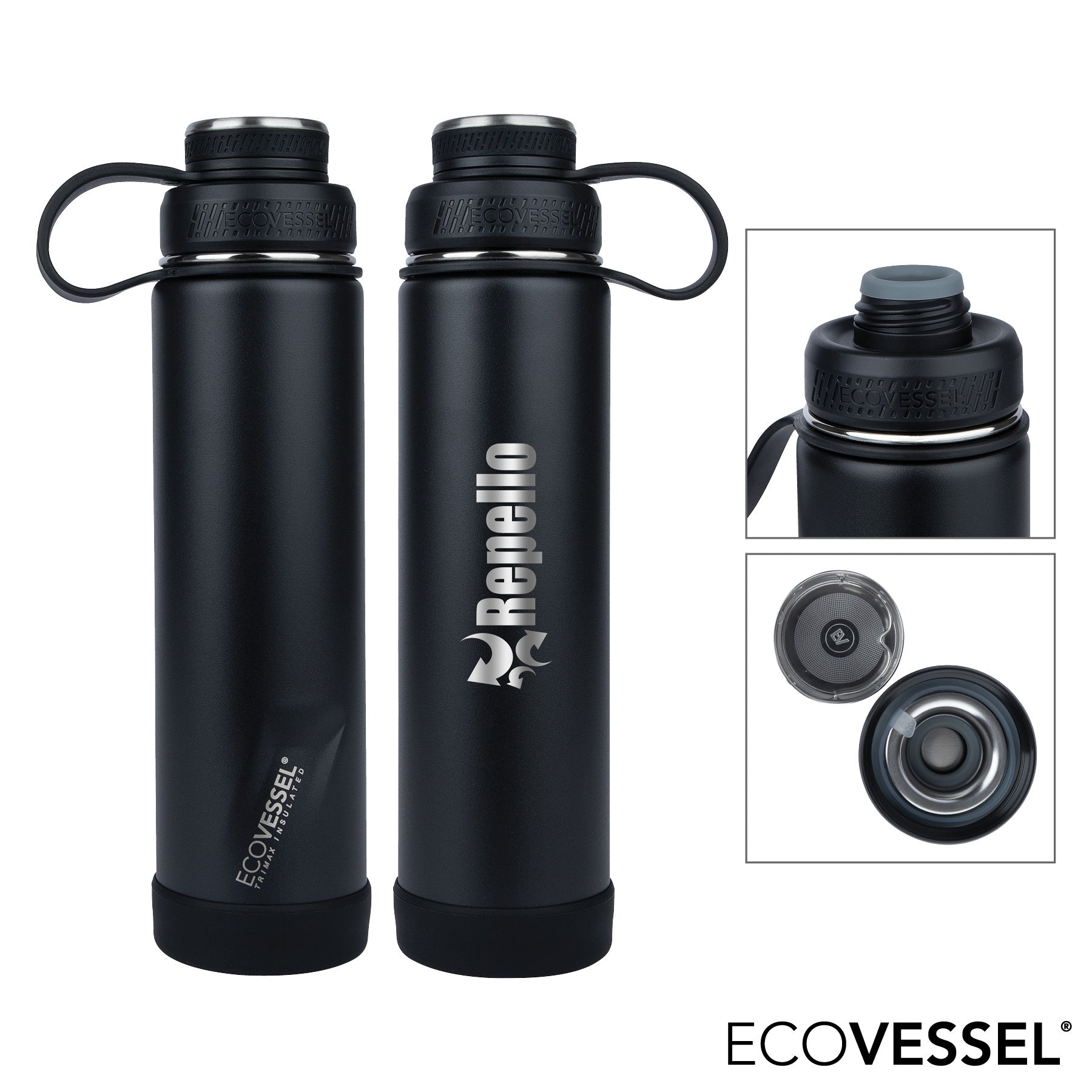 Keep the EcoVessel® 24 oz. Boulder Water Bottle in your car cup holder for a long road trip or daily commute and stay healthily hydrated throughout the day. Its 18/8 double wall stainless steel vacuum insulated construction with copper lining keeps your drink cold up to 60 hours and hot up to 12 hours. The dual opening lid features a wide mouth for easy filling and a small mouth for drinking and its insulated stainless steel interior provides better temperature retention and prevents drinks from touching plastic. The soft silicone spout provides a comfortable drinking experience, and the cap is securely attached to a sturdy carrying strap so it won't get lost. The Boulder also features a removable stainless steel strainer and a silicone base cap to prevent bottle and tabletop damage. Through their partnership with 1% for the Planet, EcoVessel donates a minimum of 1% of all sales to various environmental nonprofits. FDA compliant and BPA Free.
