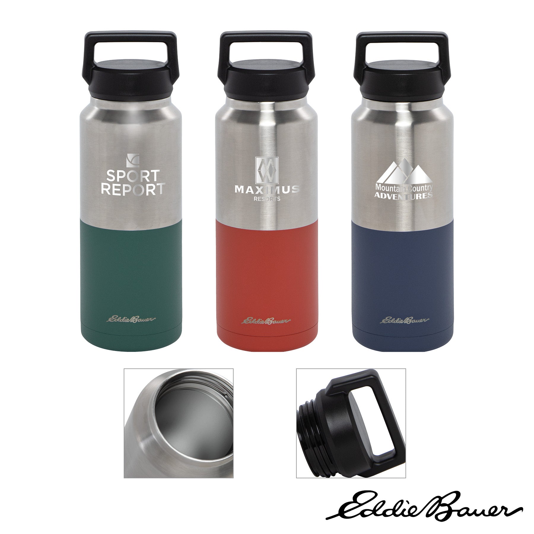 Stay hydrated with the 33 oz. Eddie Bauer® Mesa 2-Tone Bottle and surely it will become your perfect adventure companion 365 days a year! The bottle has a unique two-tone finish with brushed steel on its upper body and a durable powder coat finish on the bottom half. Its double wall vacuum sealed construction helps keep your hot drink hot for 12 hours and cold drink cold for 24 hours. The leak-proof screw top lid with integrated carry handle is easy to drink from and to travel with. FDA compliant and BPA Free.