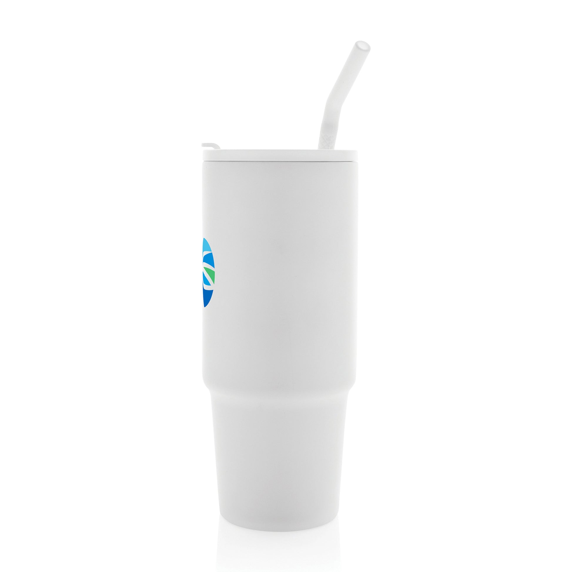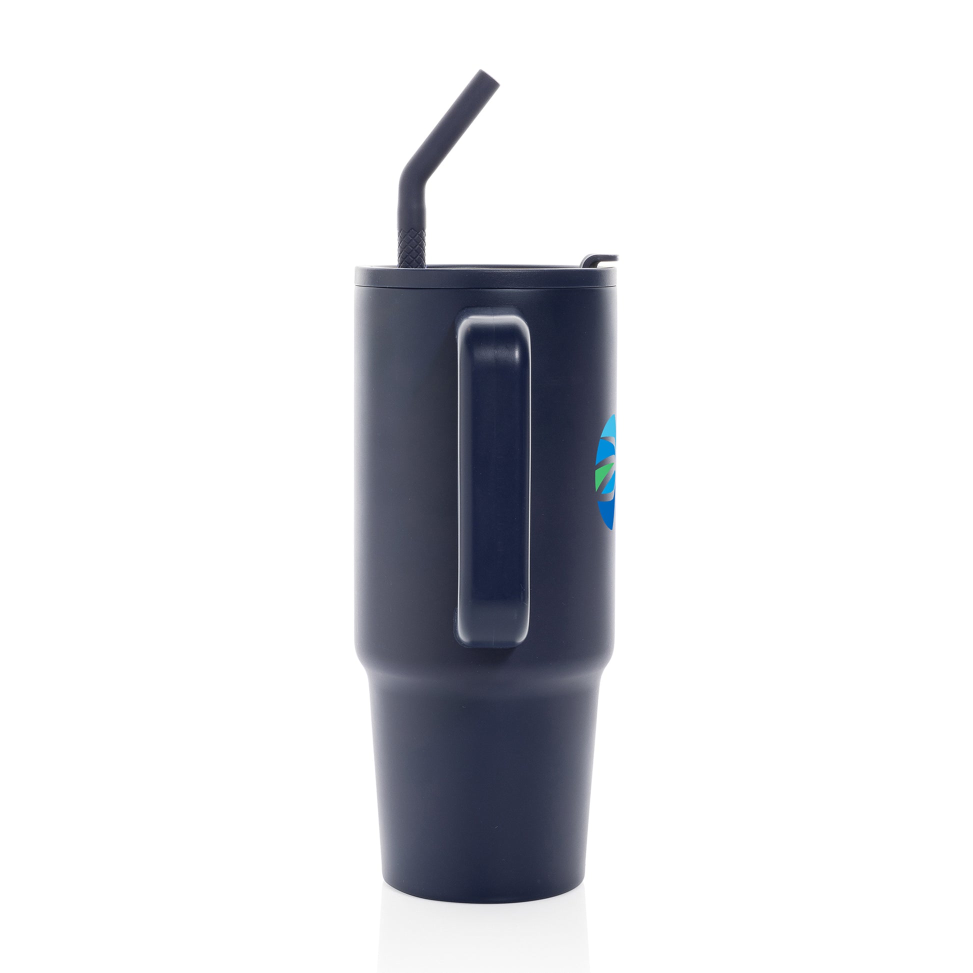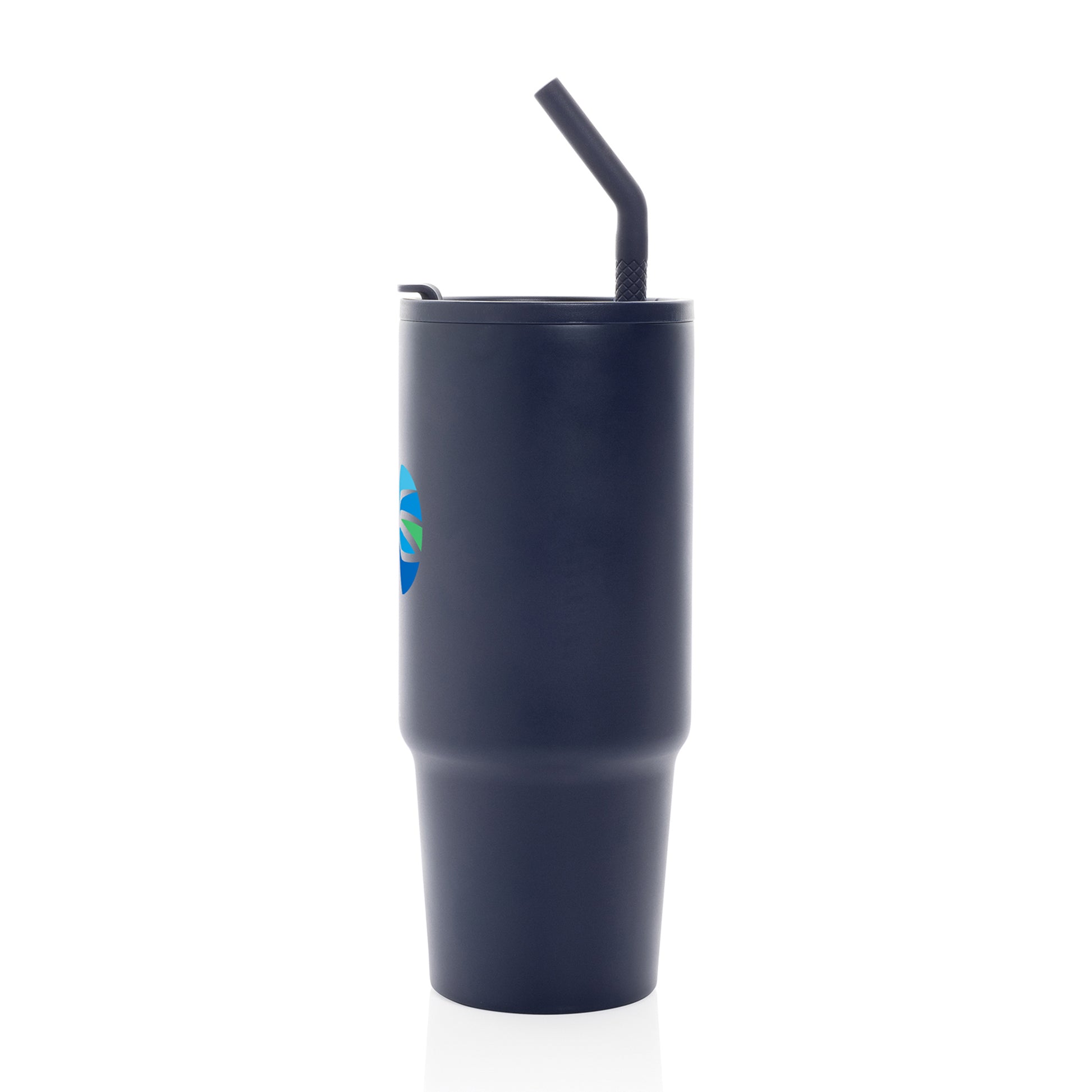 Stay refreshed with this 900 ml (30.4 oz.) RCS-certified tumbler made from 70% recycled stainless steel. Double-walled and vacuum-insulated, it keeps drinks at the right temperature while the slim base fits most cup holders. Includes a spill-secure screw-on lid with spout, recycled steel straw, and silicone tip. BPA-free and packaged in a gift box, it’s built for daily hydration with comfort-grip handle.