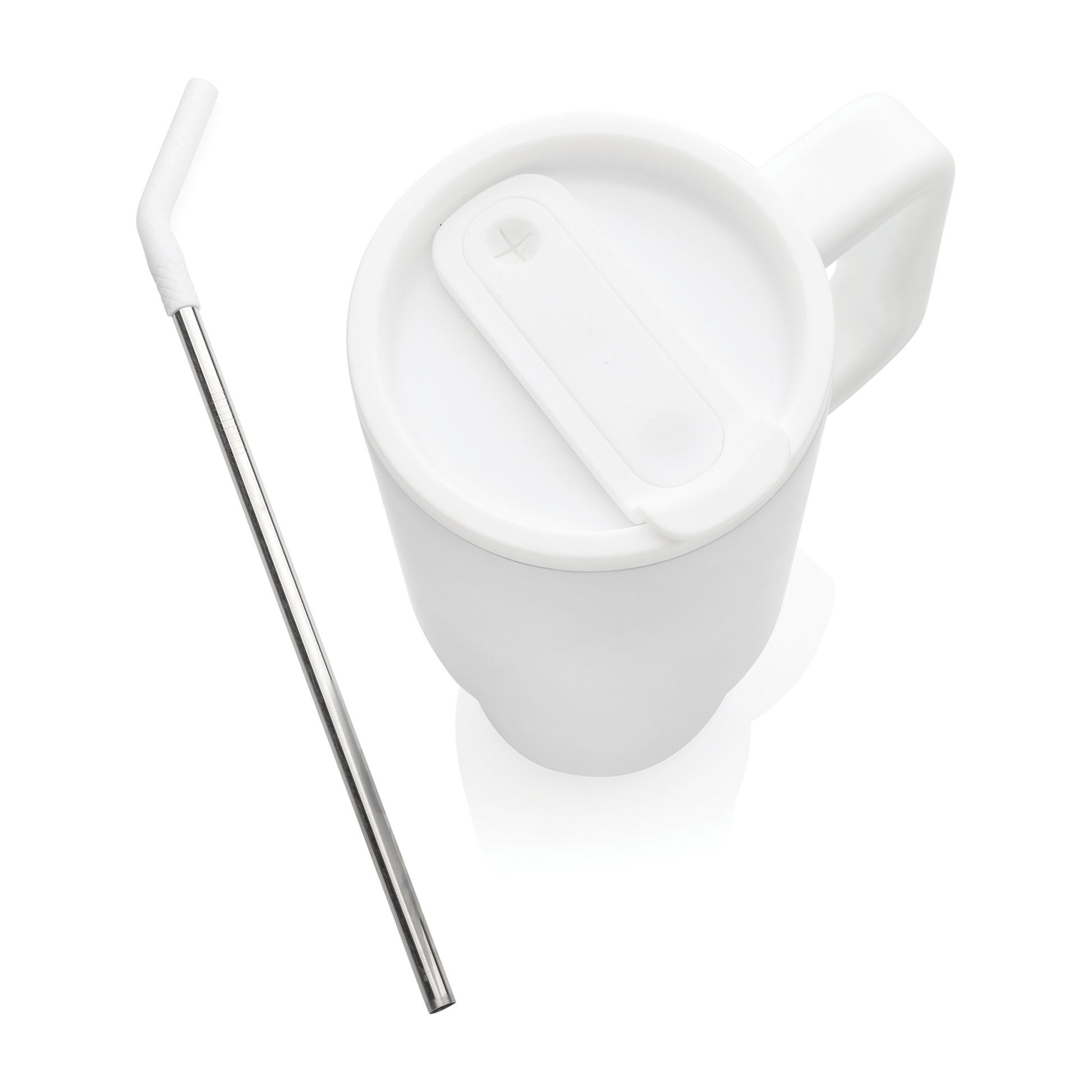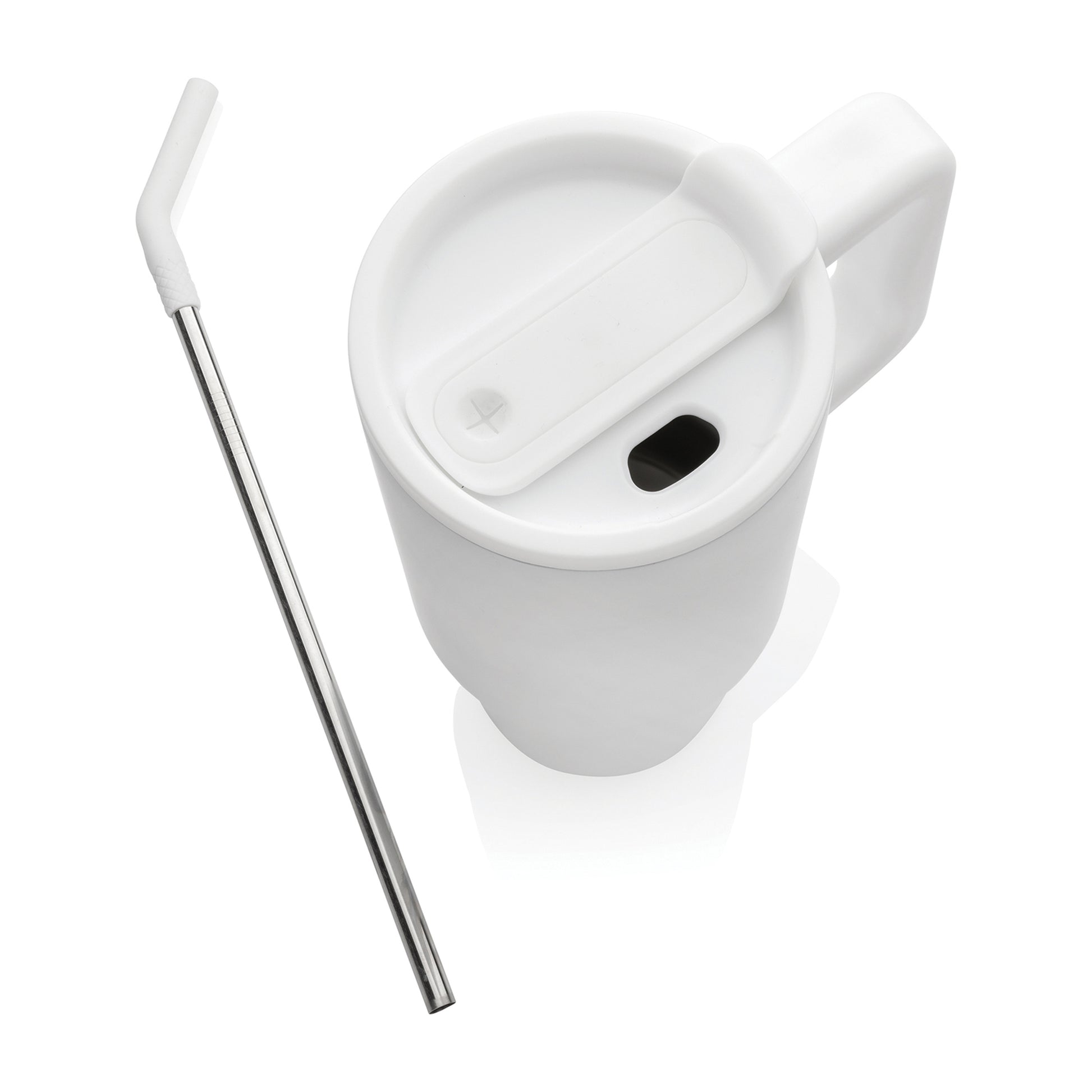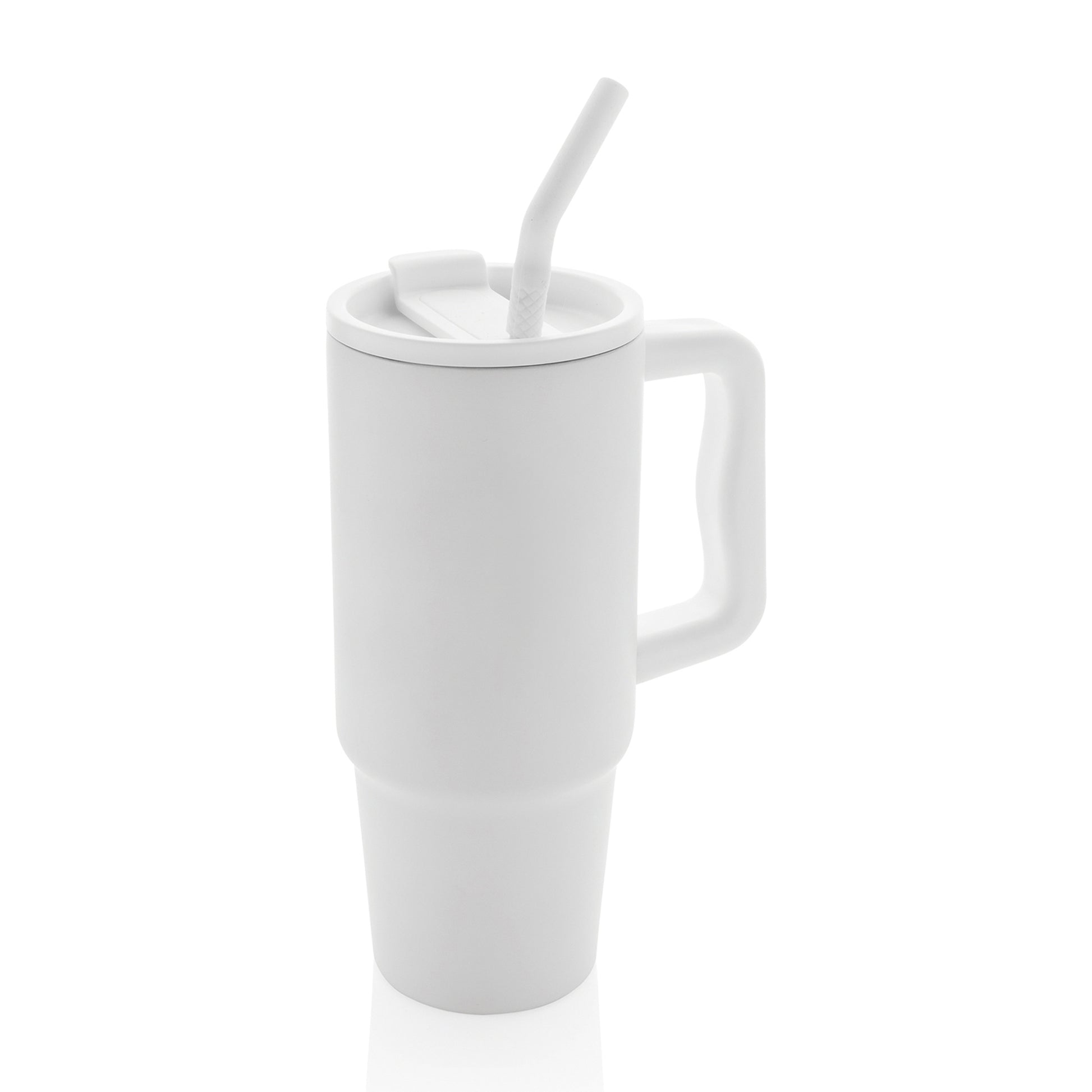 Stay refreshed with this 900 ml (30.4 oz.) RCS-certified tumbler made from 70% recycled stainless steel. Double-walled and vacuum-insulated, it keeps drinks at the right temperature while the slim base fits most cup holders. Includes a spill-secure screw-on lid with spout, recycled steel straw, and silicone tip. BPA-free and packaged in a gift box, it’s built for daily hydration with comfort-grip handle.