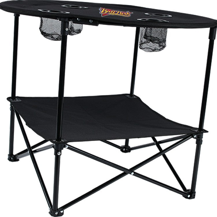 Your game day crap won't fill up your lap! This large table seats 4 – whether it's for a tailgate spread or a family picnic. Four drink holders ensure spill-proof entertainment while the soft shelf underneath provides added space. The table top easily pops into place. When not in use, the legs/frame and table top folds down to fit inside the zippered carry bag. 600D poly table top and carry bag. Steel frame. The ideal folding table for tailgating, picnic, sporting events, concerts, festivals, entertaining.