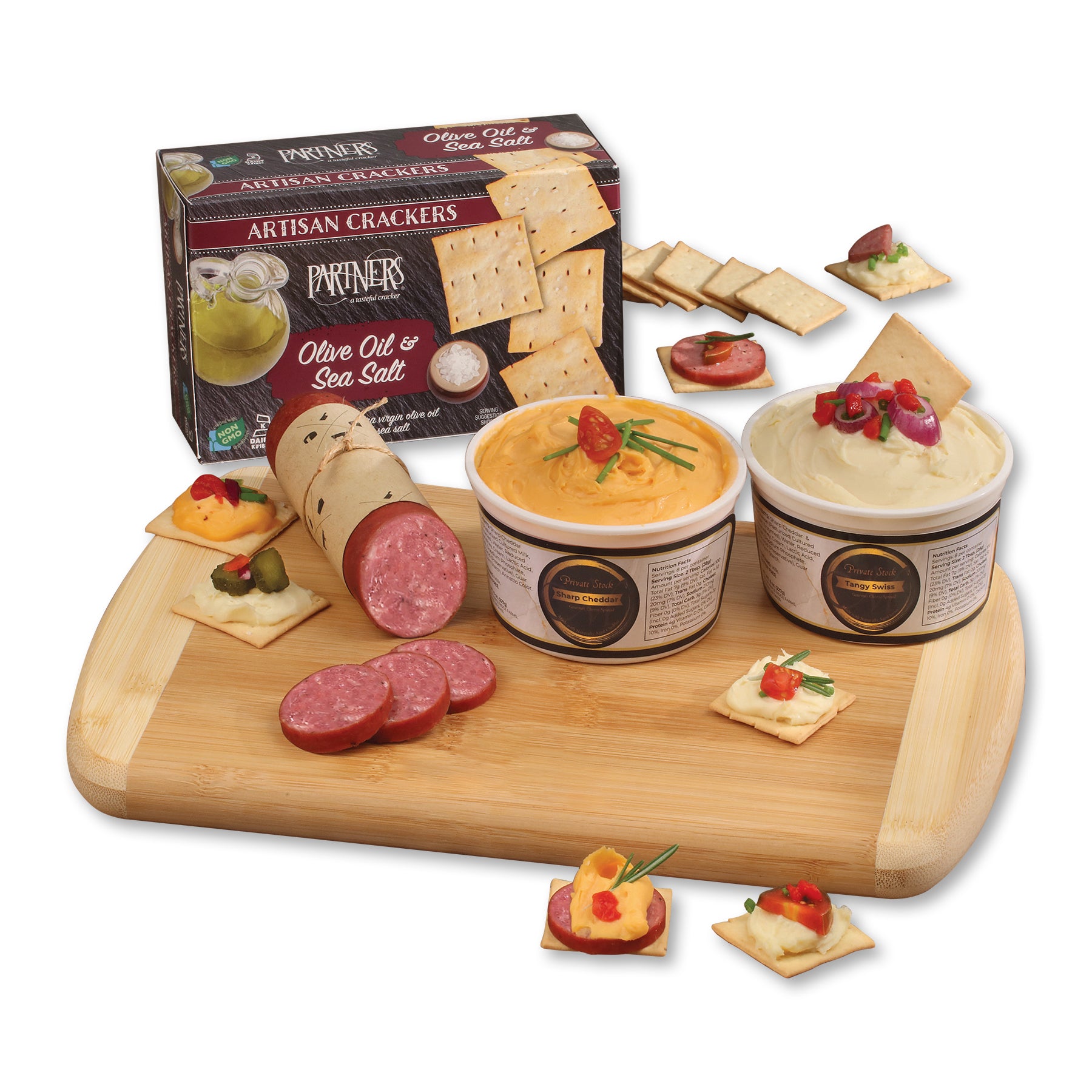 This sustainable bamboo cutting board comes packed with everything you need for a delicious, cheesy snack. Olive oil and sea salt crackers are just waiting to be topped by two gourmet cheese spreads: sharp cheddar and swiss. Savory beef summer sausage provides the ideal accompaniment to truly set the flavors apart. For the final touch, we firebrand the reusable board with your logo to remind them of your appreciation for years to come. Contents: Beef Summer Sausage, 5 oz. Olive Oil & Sea Salt Crackers, 2 oz. Shelf Stable Sharp Cheddar Cheese Spread, 1/2 lb. Shelf Stable Tangy Swiss Cheese Spread, 1/2 lb.