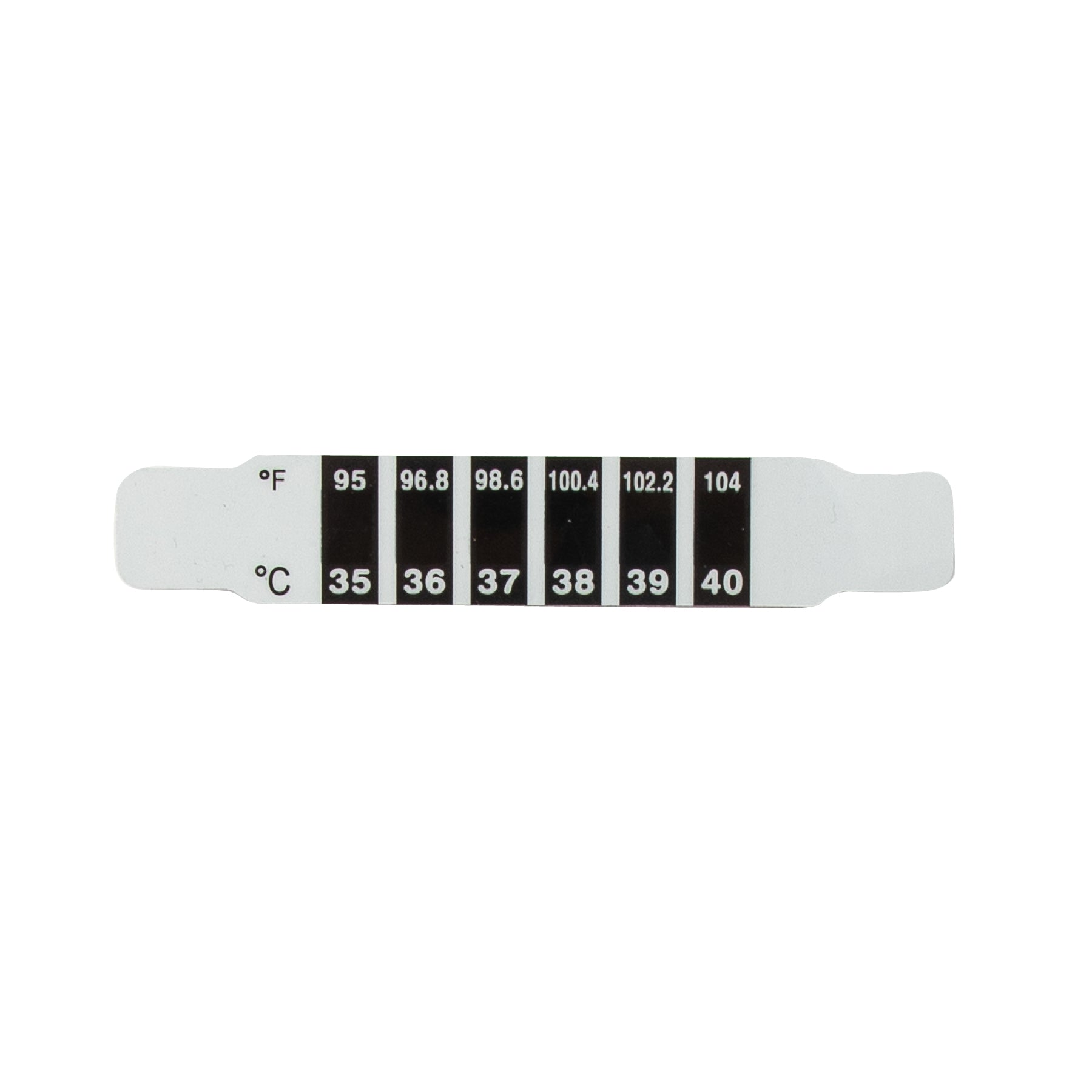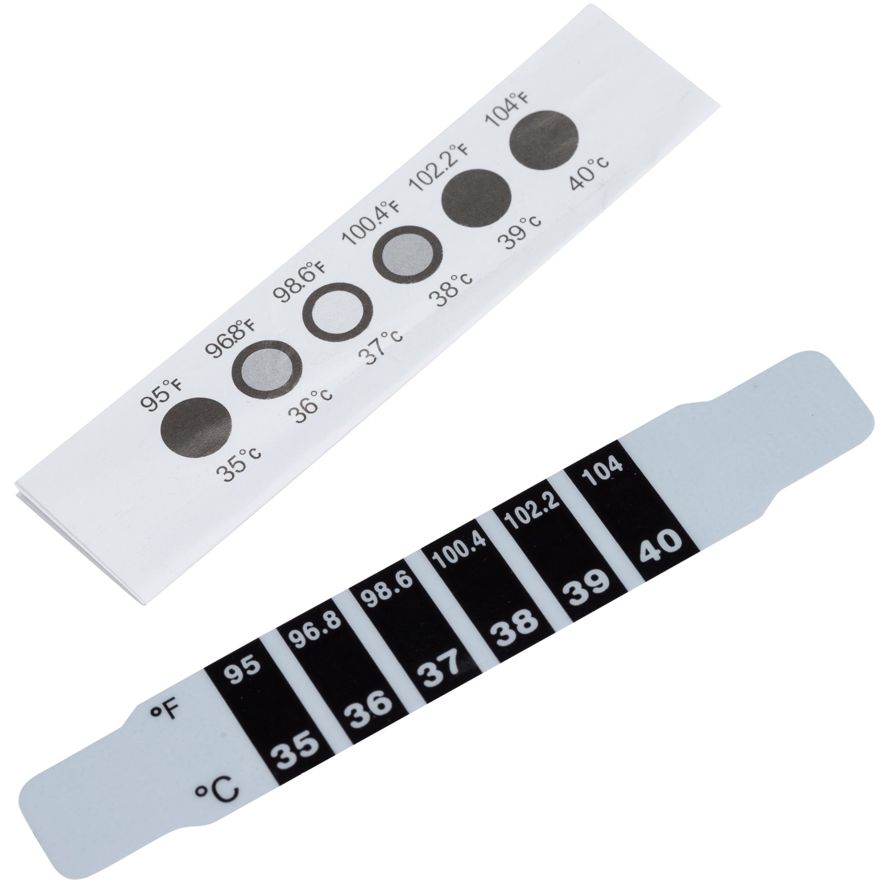 The Feverscan Thermometer Test Strip is an easy and safe way to test for a high fever. Simply place the black side against a dry, unobstructed forehead for 15 seconds. The black boxes change color with heat and are marked with Celsius and Fahrenheit measurements. Wipe the reusable test strip down with a dry cloth after use and store it in its included polybag out of direct sunlight between uses. Includes instructions.