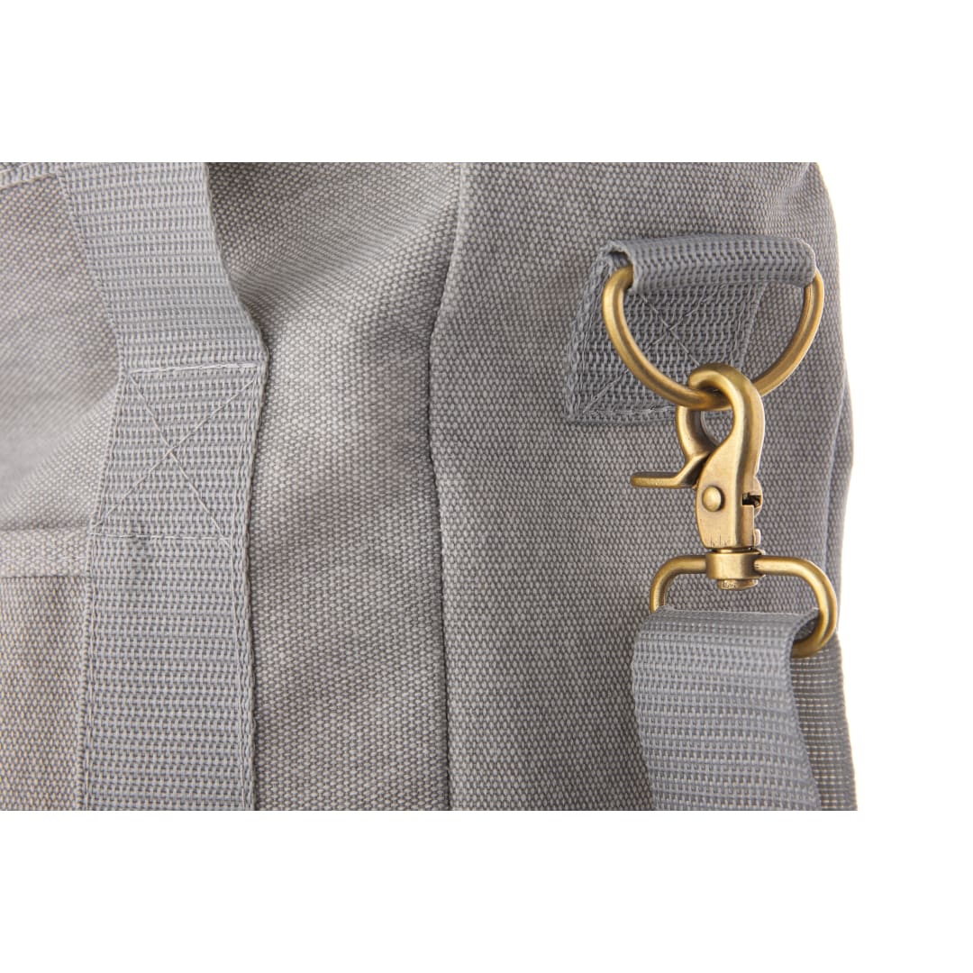 Open main compartment with patterned lining. Front pocket with snap closure. Vinyl accent bottom and carry handles. Trolley strap on back. Adjustable length shoulder strap. Disclaimer: Due to the dyes used & natural fabric, there will be slight color variations from the images shown.