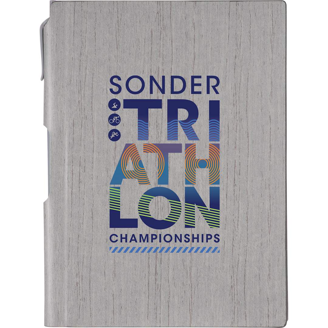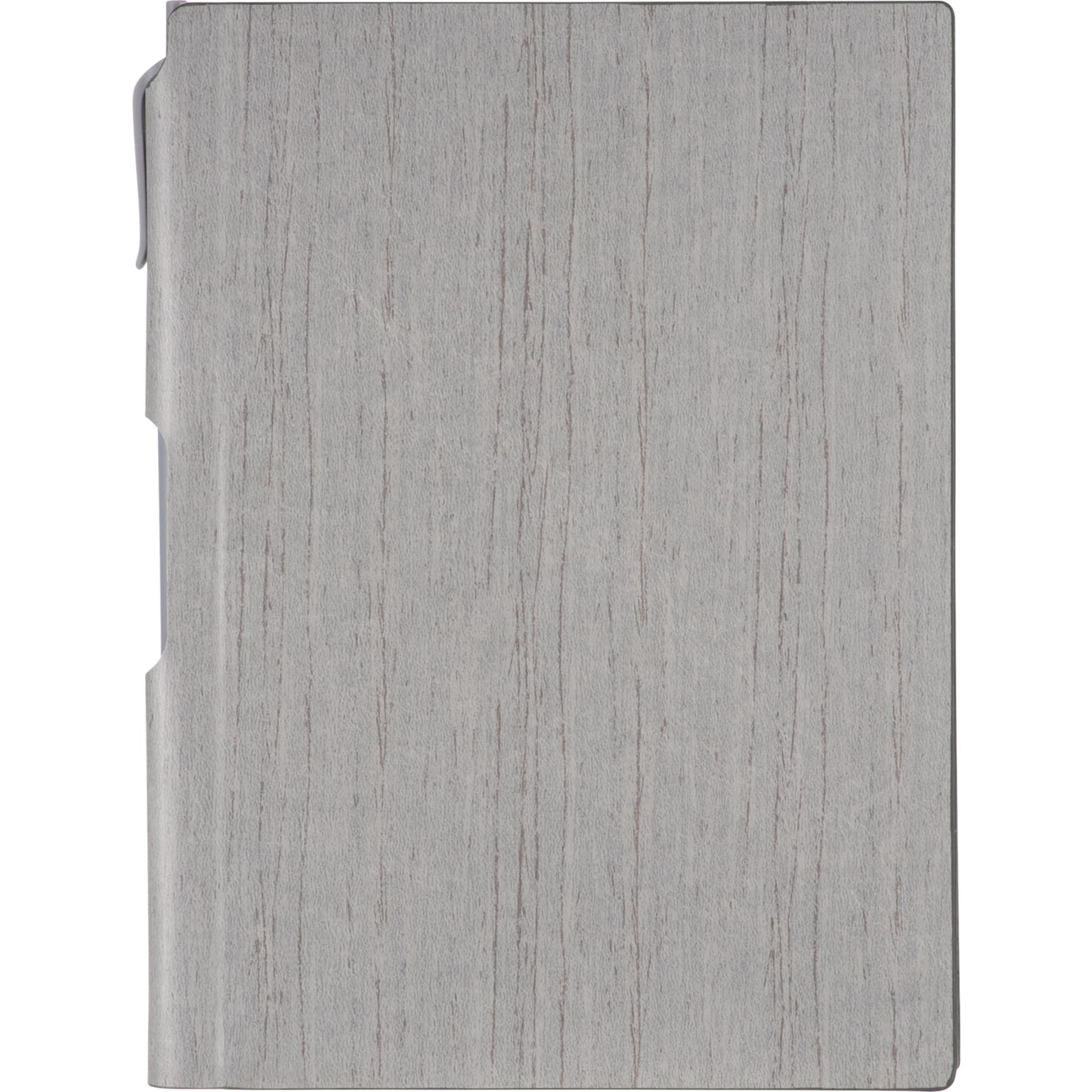 The Bullet 6" x 8.5" FSC® Mix Bari Notebook with Pen is an A5 bound notebook designed to look like wood. This attractive notebook includes 80 sheets of beige ruled FSC® Mix paper and a matching plastic ballpoint pen that can be tucked away in the spine. Note that pens are packed separately.
