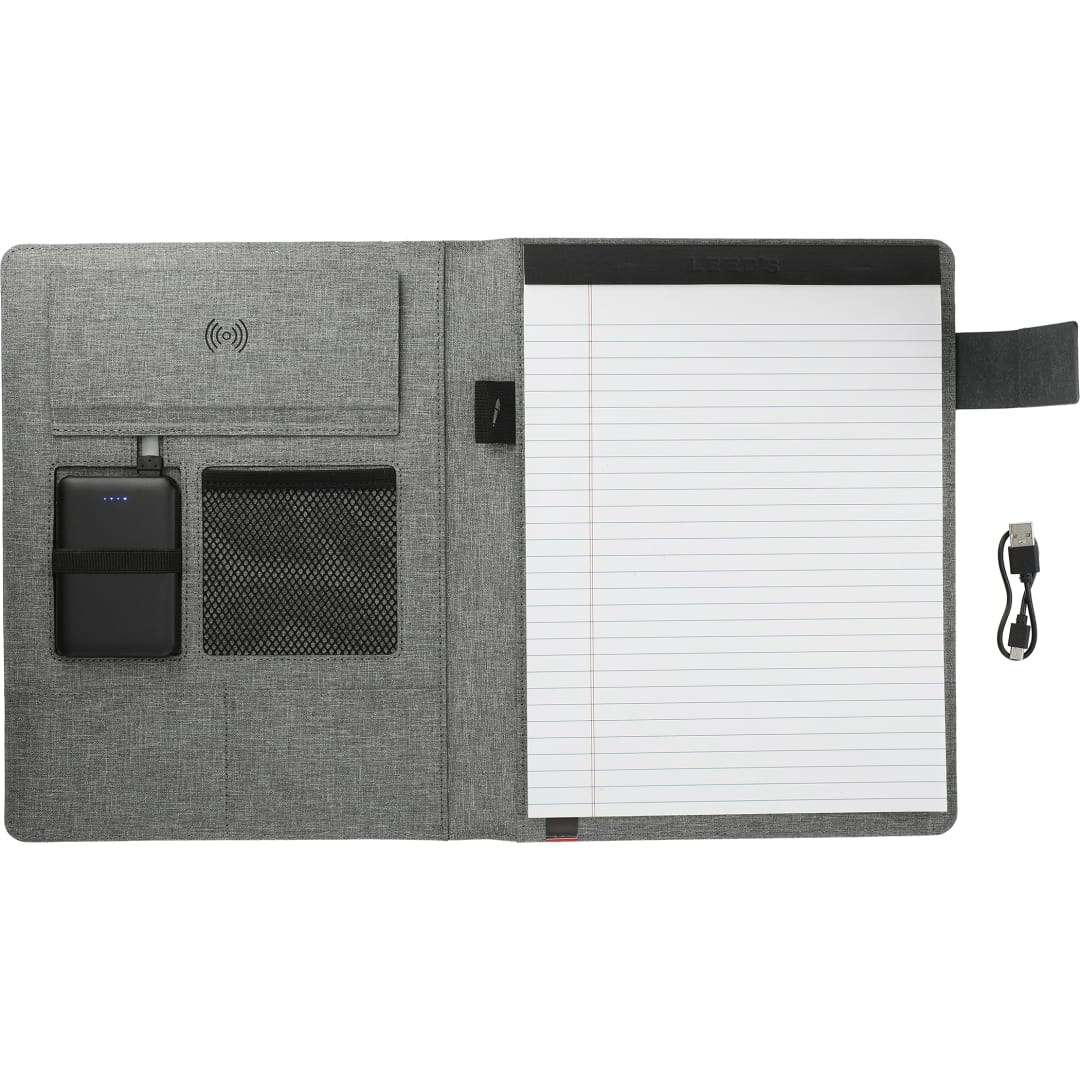 The Reclaim RPET 5000 mAh Wireless Charging Writing Pad with FSC® Mix Paper is a rechargeable powerbank that supports wireless charging for a wide range of mobile devices, including the iPhone 8 and later generations. It comes with one USB to Micro USB cable, enabling you to charge any device with a Micro USB input or recharge the Reclaim itself. To charge an iPhone 7 or earlier series that does not feature built-in wireless technology, simply connect the Micro USB cable. The Reclaim RPET doubles as a journal, containing one 8.5'' x 11'' FSC® Mix writing pad with 30 sheets of recycled lined paper. For added functionality, the writing pad features a front pocket, interior mesh pocket, snug elastic pen loop, magnetic closure clasp, and card organizer pockets.